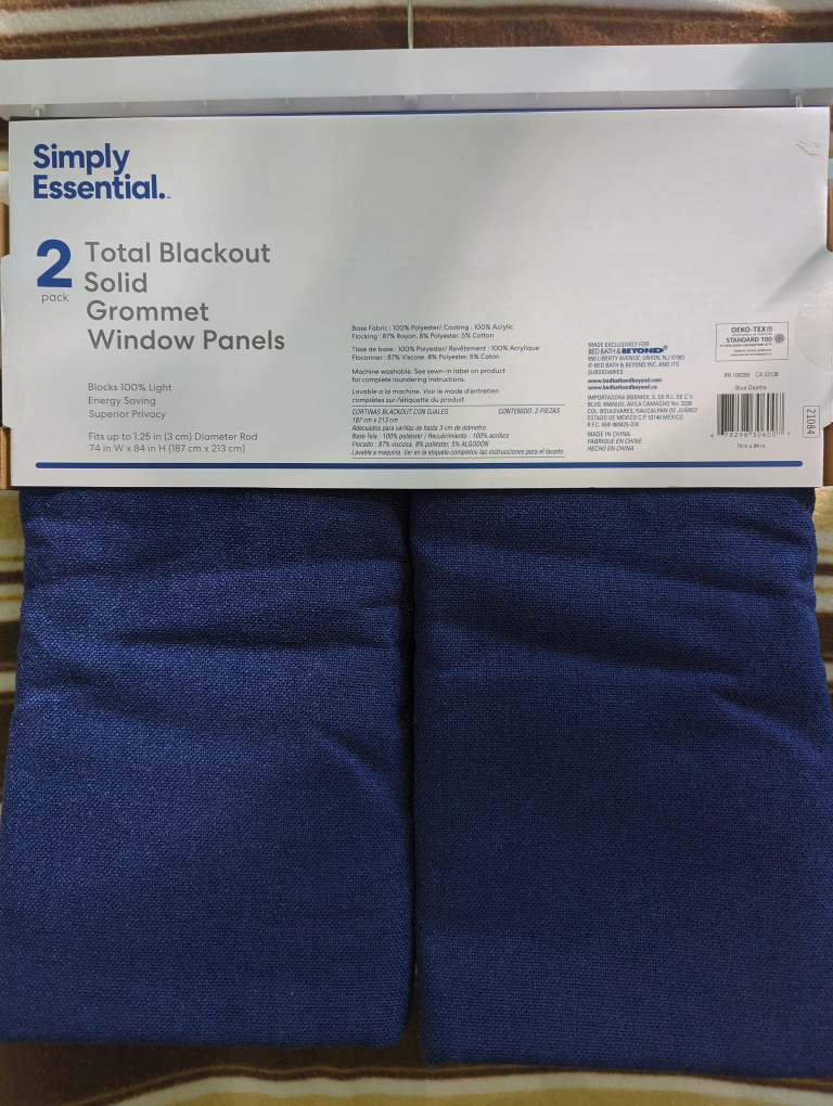 Two sets of 2-pack Total Blackout Window Panels in a deep blue colour. Bought but never used. Comes with original packaging and hanger. Machine washable.