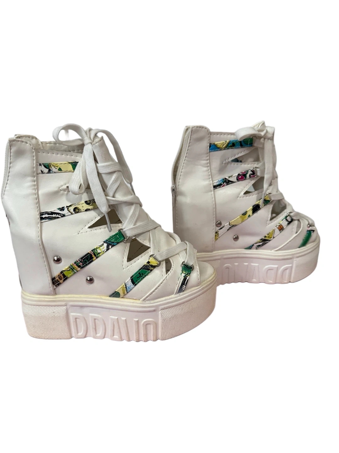 Cute DDAUO platform wedge sneakers in white! They have a unique design with colourful accents and a lace-up front. Great for adding a bit of height and style to any outfit