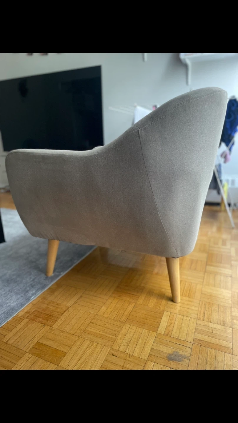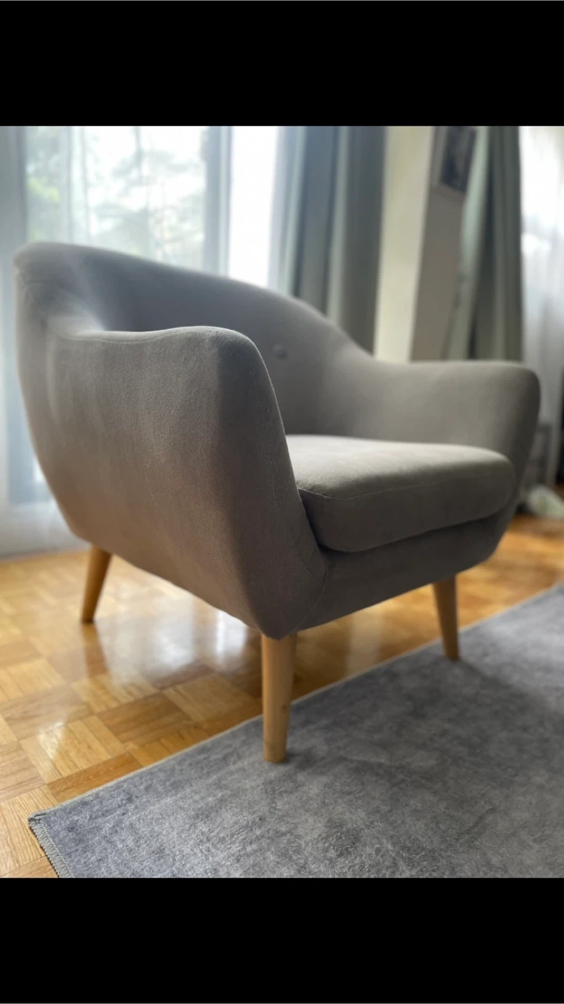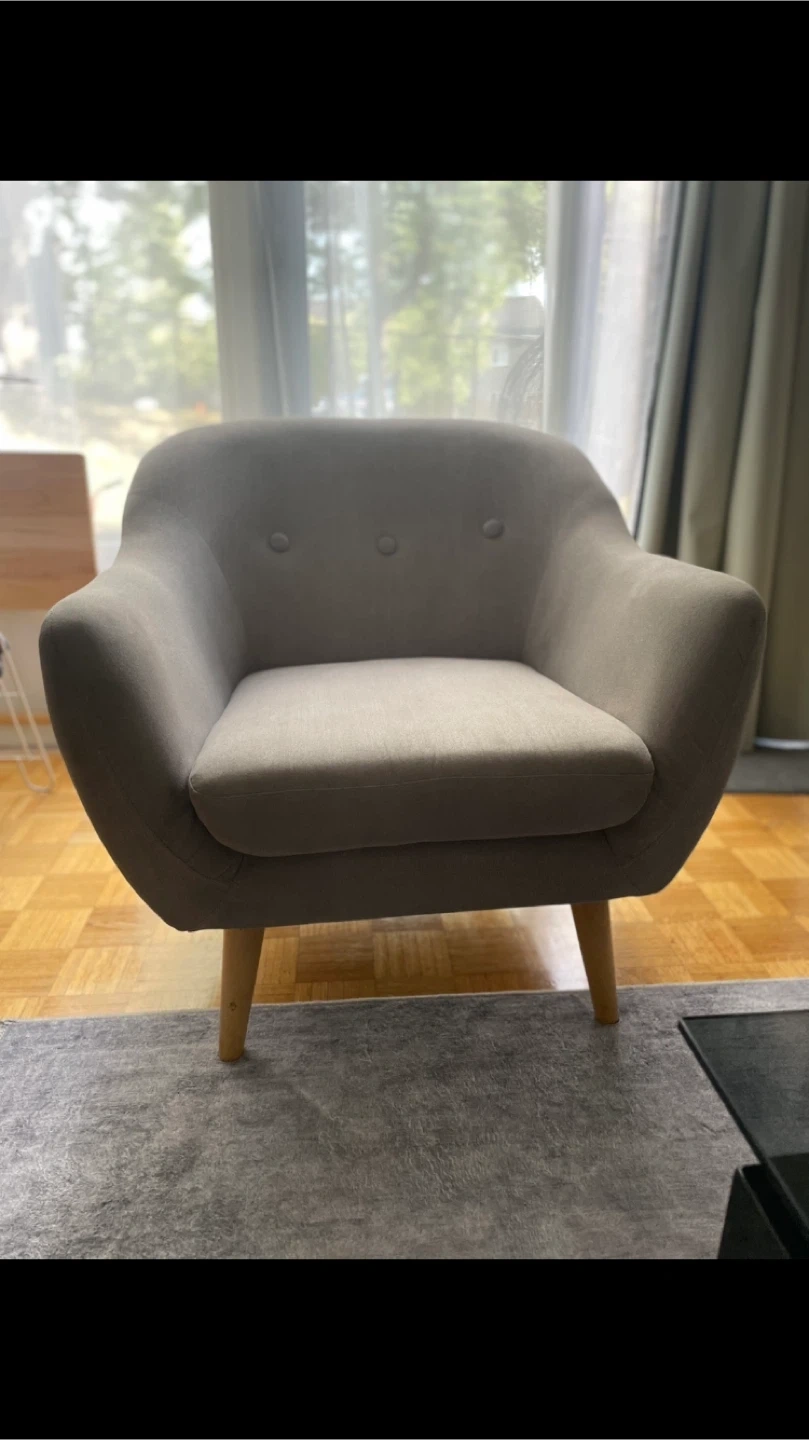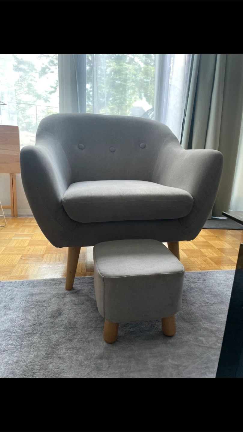 Looking to sell this comfy grey armchair with a matching ottoman! It's in great condition and would be a lovely addition to any living room or reading nook. The chair features a stylish design with wooden legs and a soft, neutral fabric. Perfect for relaxing after a long day!
