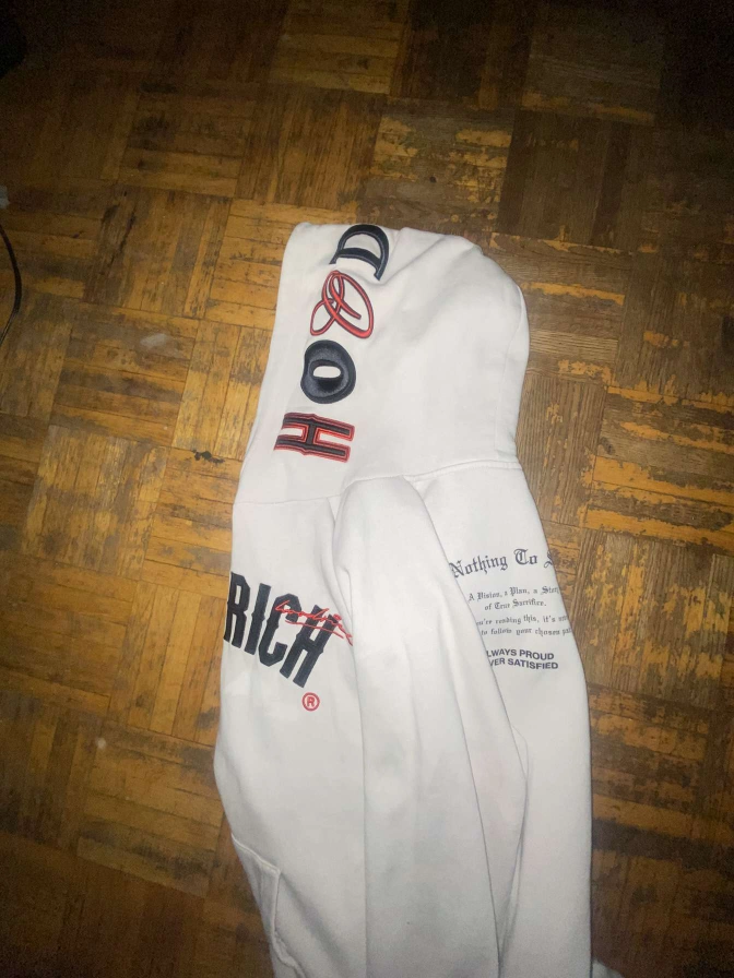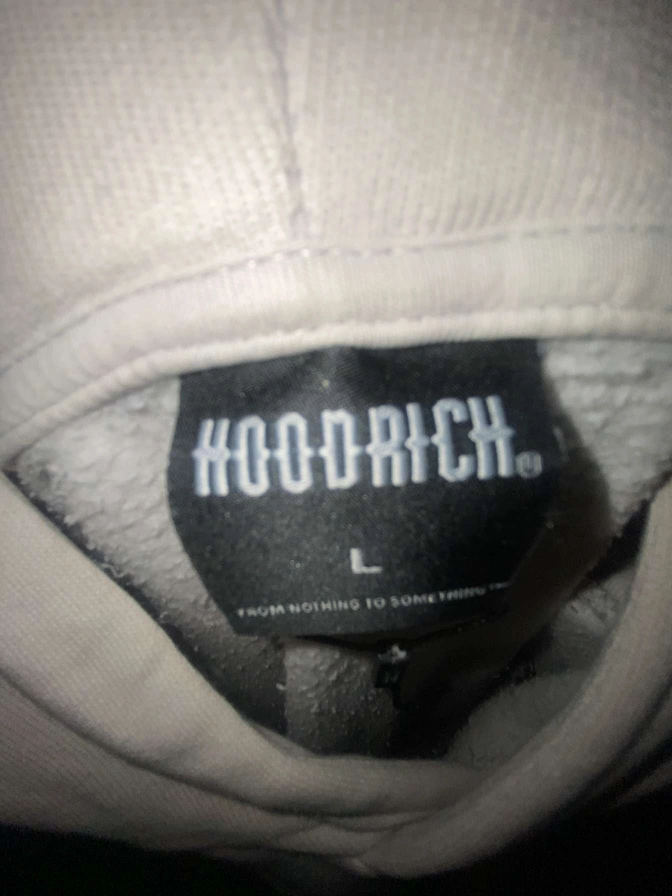 Selling a white Hoodrich hoodie in size L. It features the Hoodrich logo on the front, back, and sleeves. Good for everyday wear!