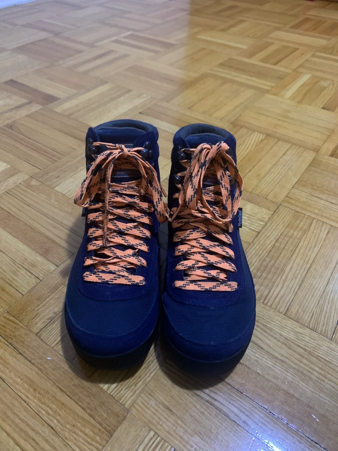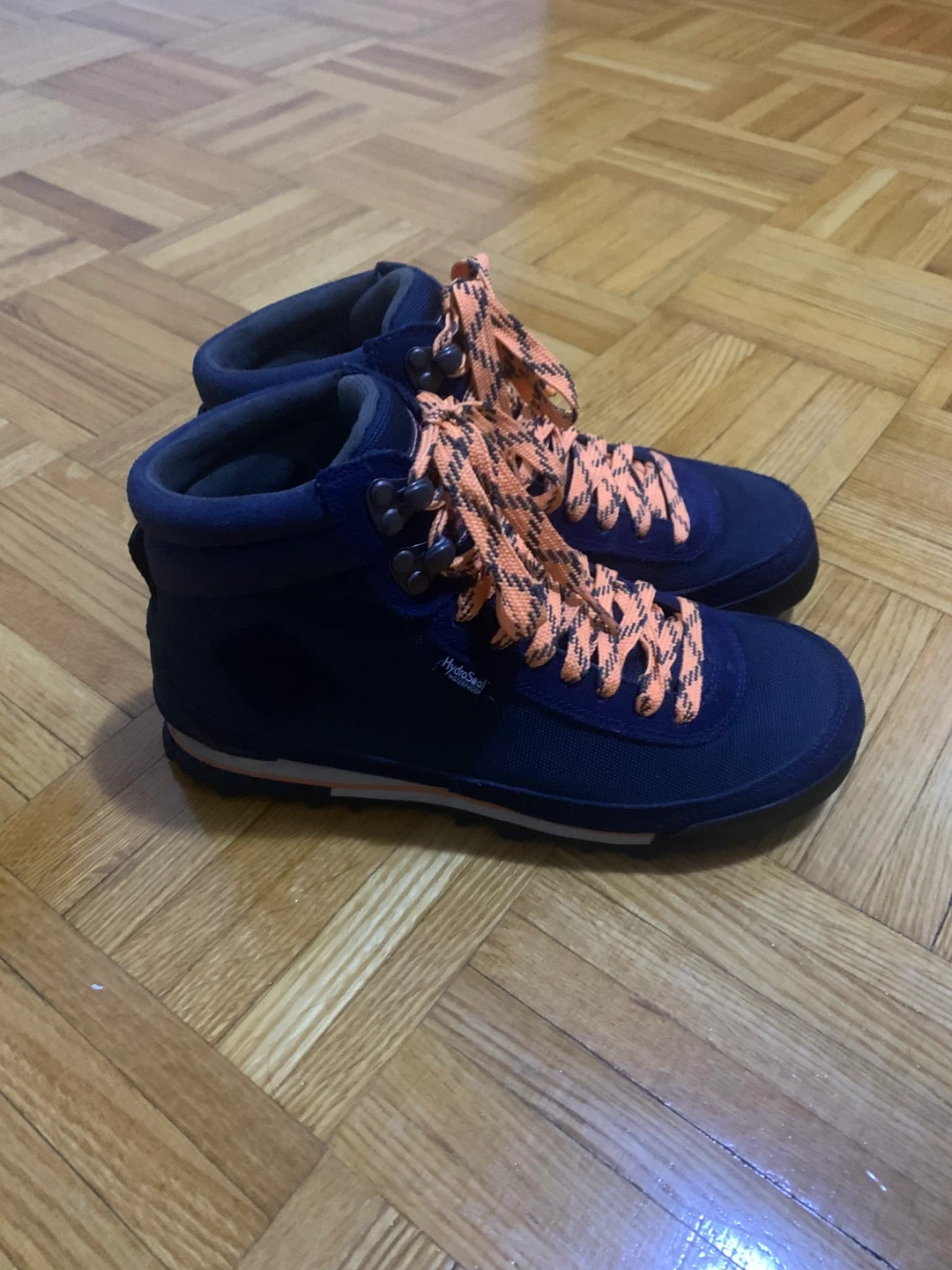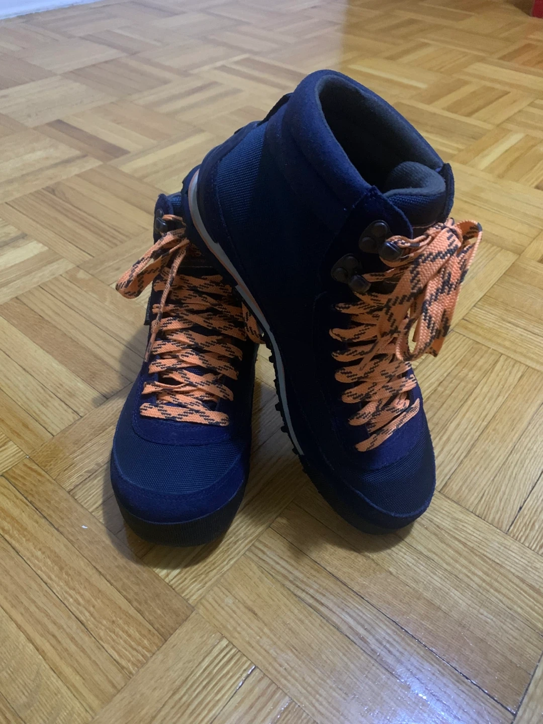 The North Face "Hedgehog" hiking boots in navy blue with orange laces. These boots are designed for comfort and durability on trails. They feature HydroSeal waterproofing for wet conditions. Suitable for hiking and outdoor adventures!