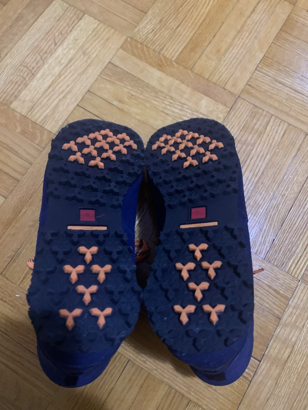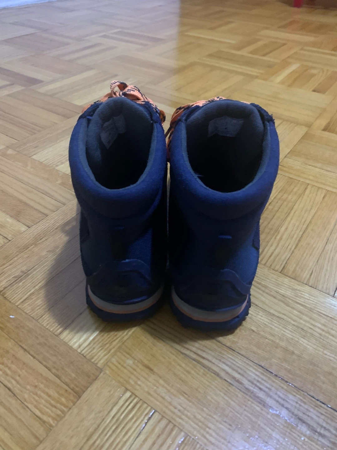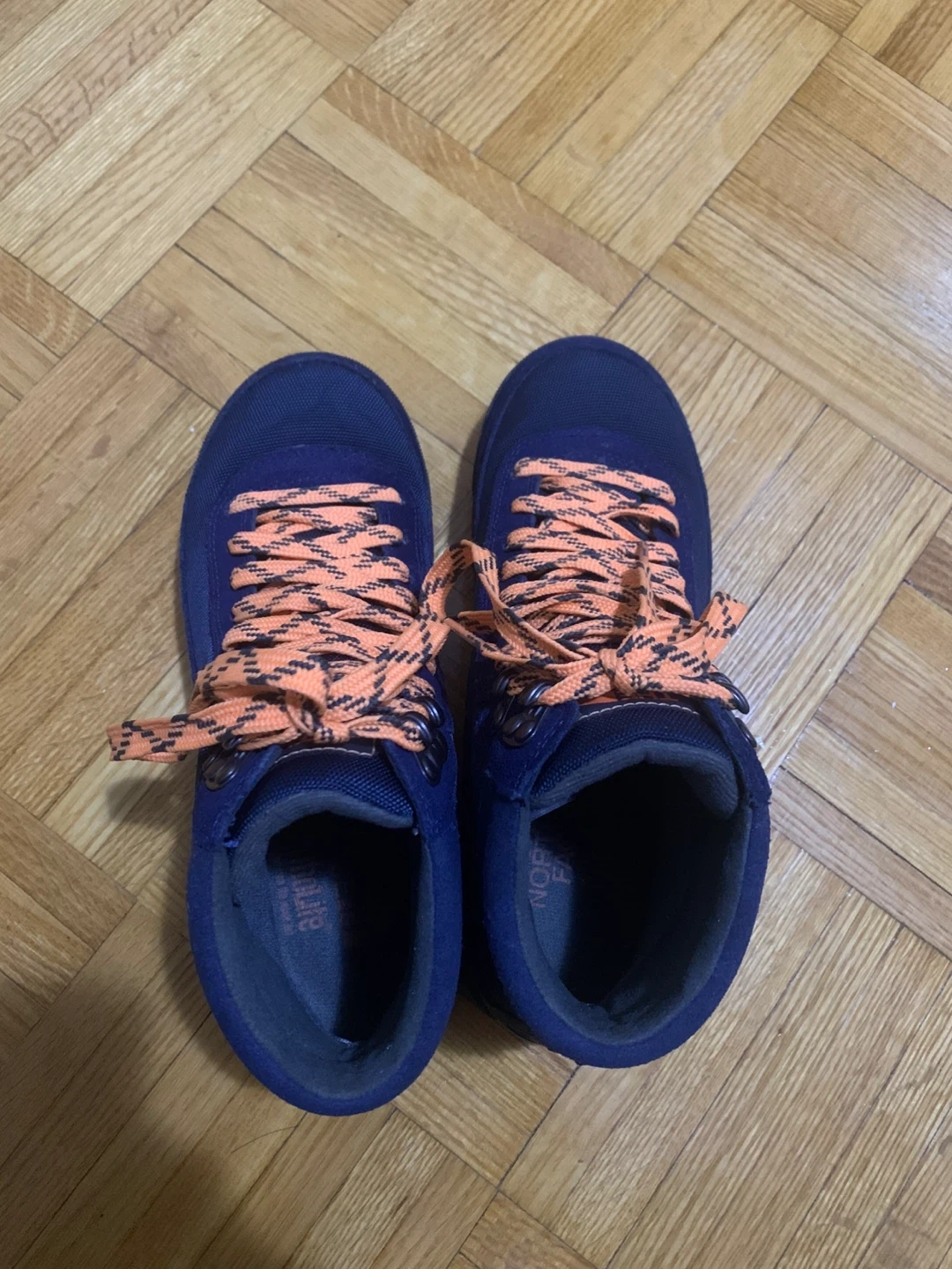 The North Face "Hedgehog" hiking boots in navy blue with orange laces. These boots are designed for comfort and durability on trails. They feature HydroSeal waterproofing for wet conditions. Suitable for hiking and outdoor adventures!
