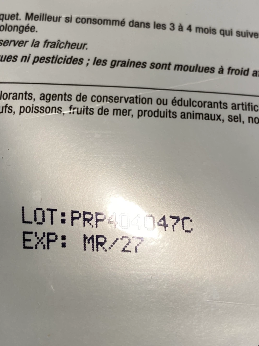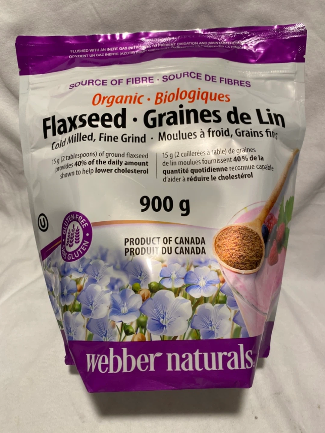 I'm selling a bag of Webber Naturals Organic Flaxseed. It's cold milled, fine grind, and a source of fibre. The bag contains 900g of product. Expiry is March/27