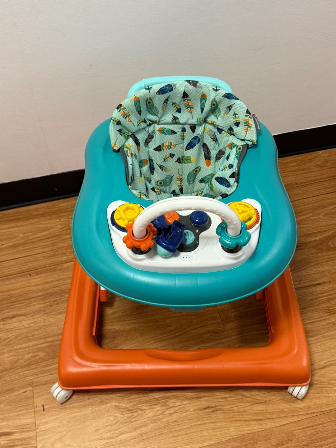 Teal and orange baby walker. It features a seat with a feather print and a play tray with attached toys. This walker helps little ones explore their surroundings!