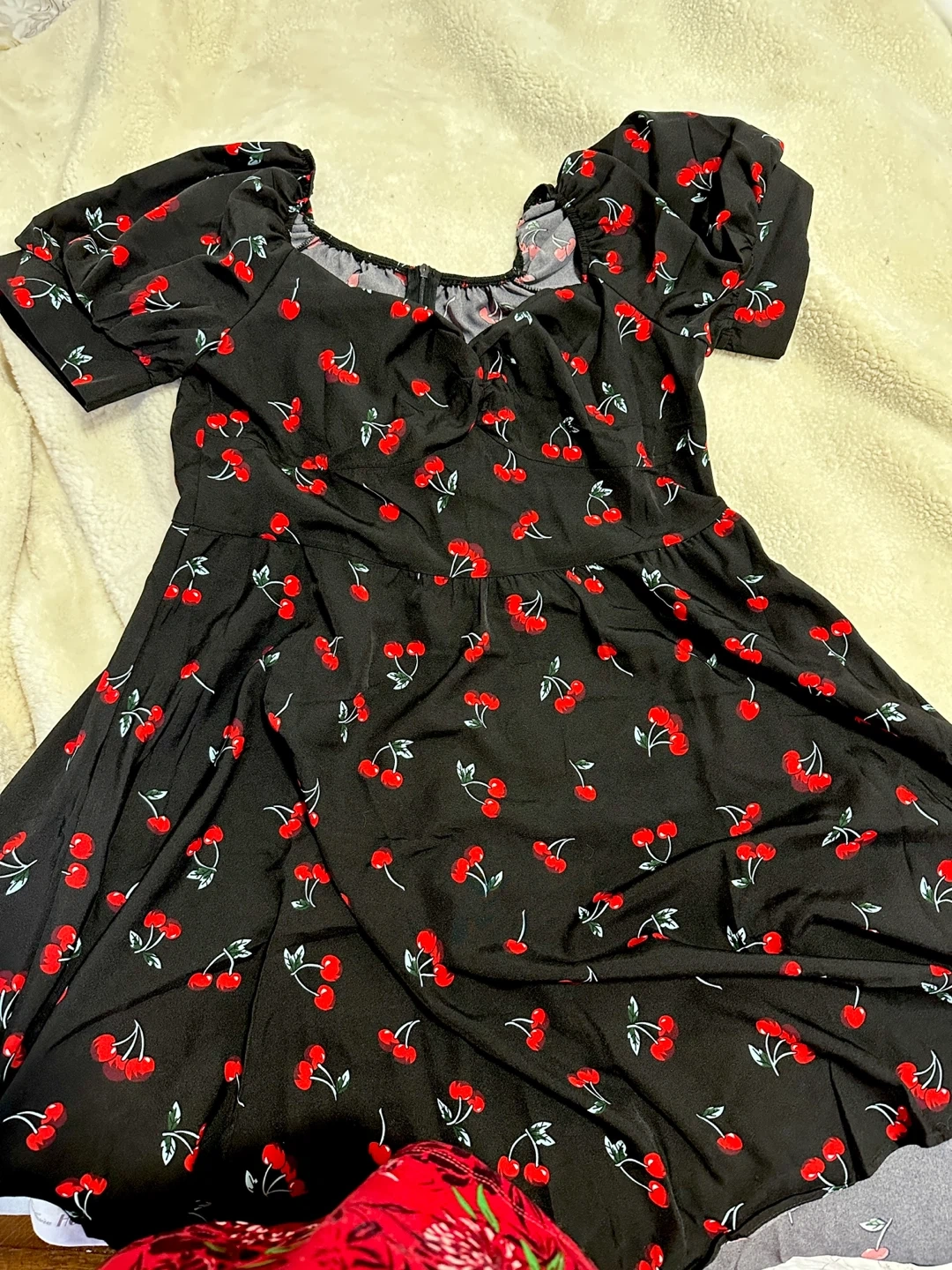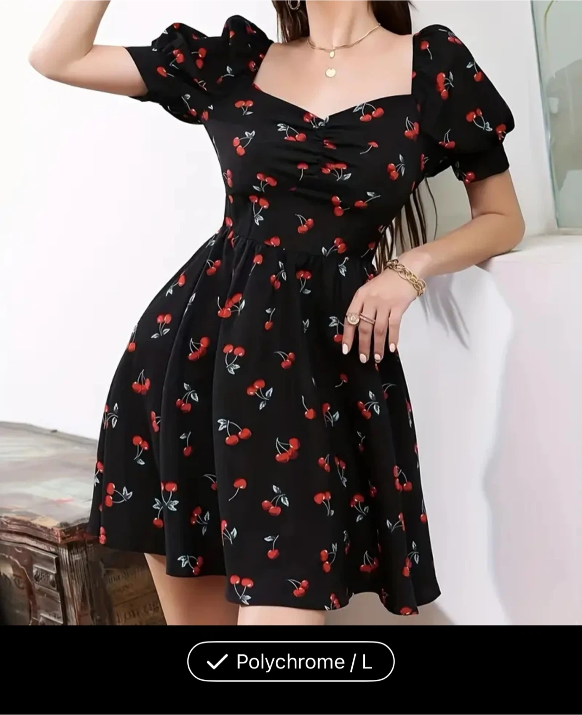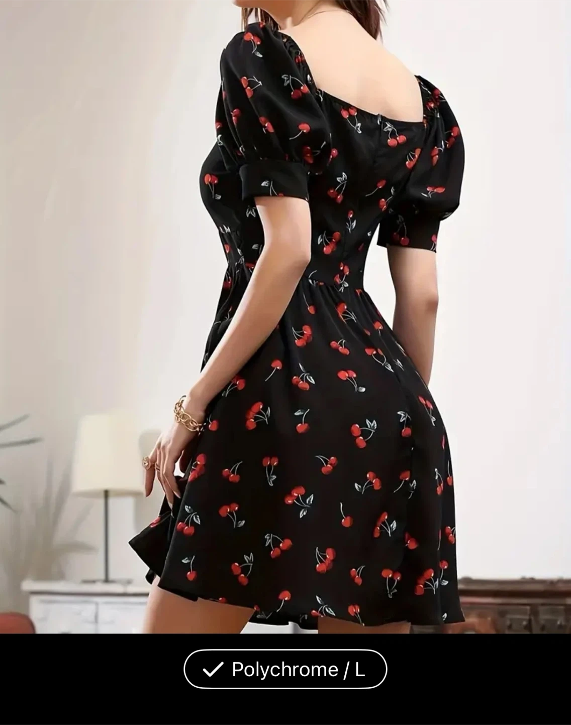 This black dress features a fun cherry print and puff sleeves. It's a size Large. Perfect for a casual outing!