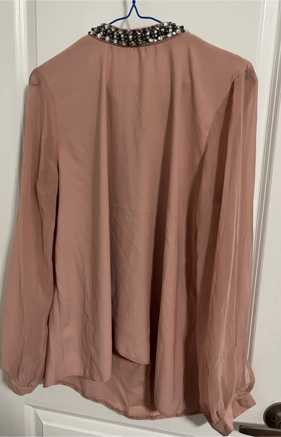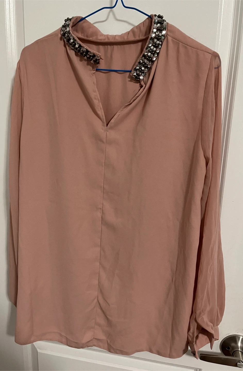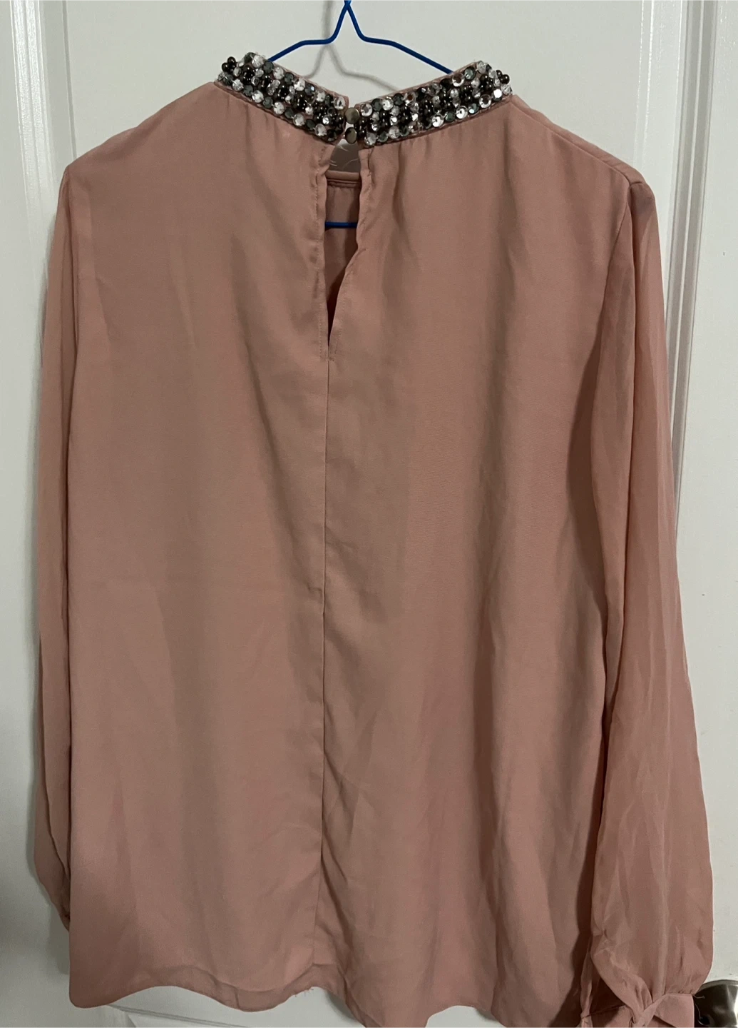 Here's a lovely pink blouse with an embellished collar! It's in great condition and would be a stylish addition to any wardrobe. The long sleeves and unique collar design make it perfect for dressing up or down. Can be worn to work or an event!