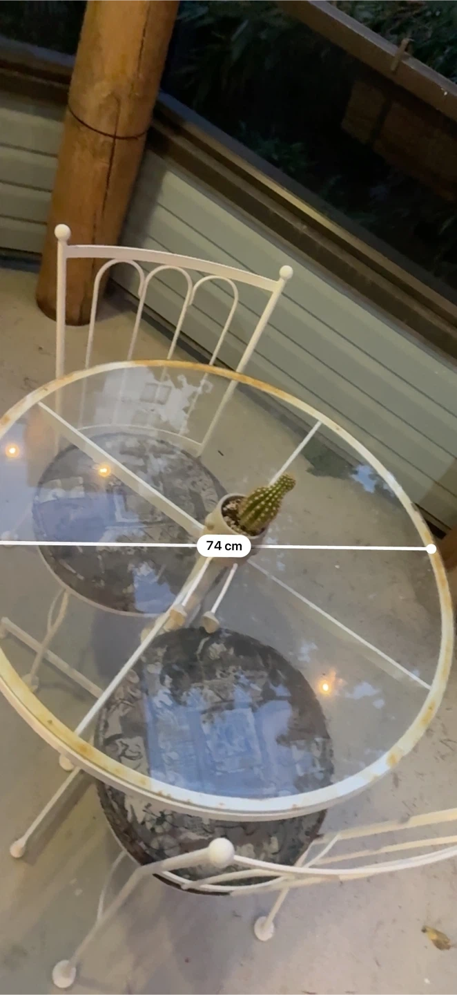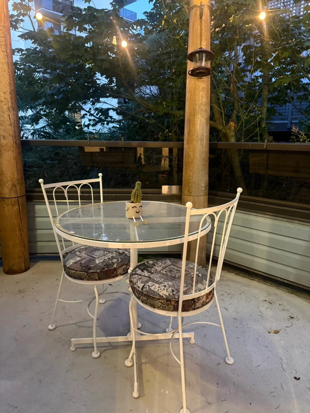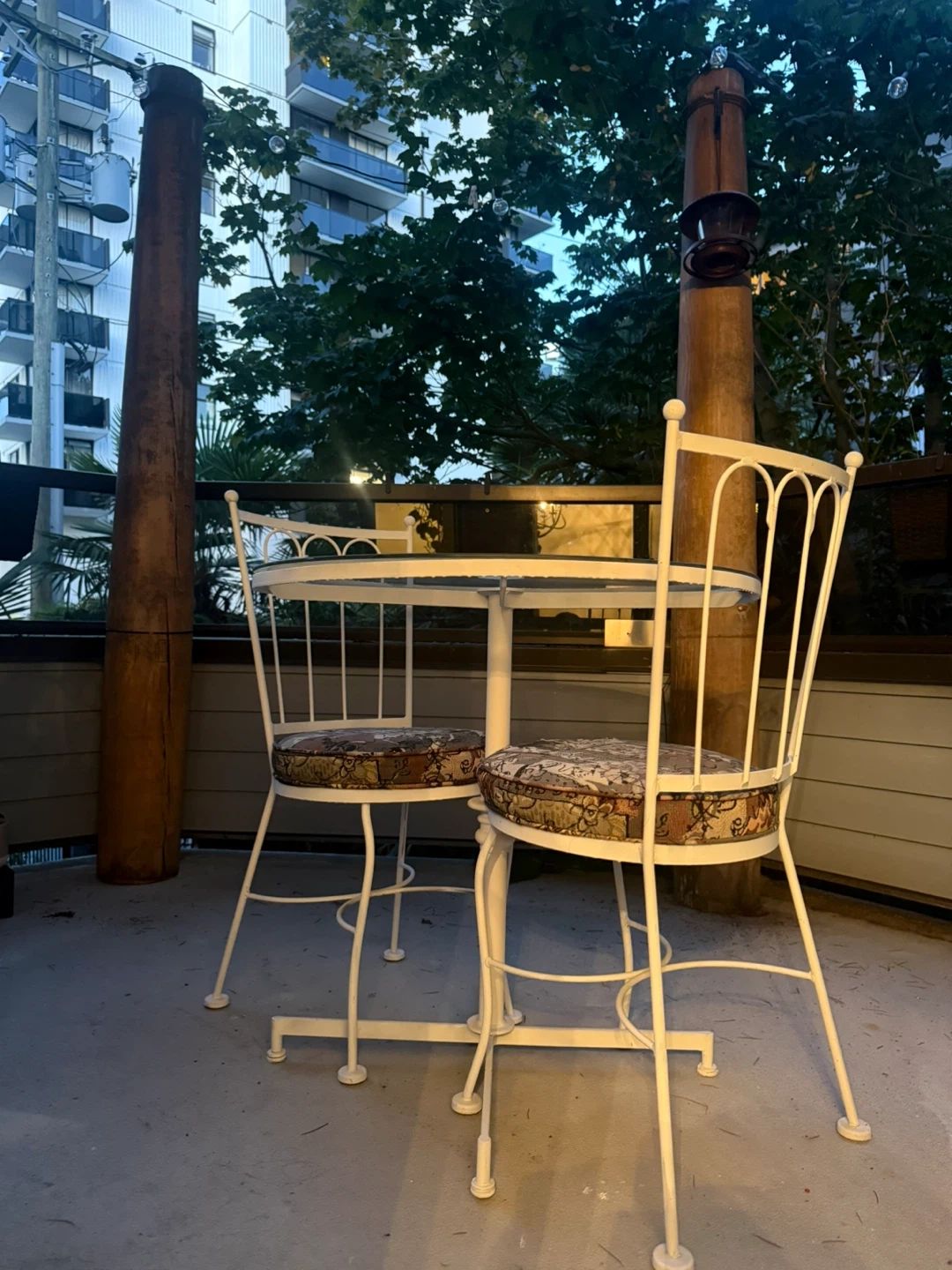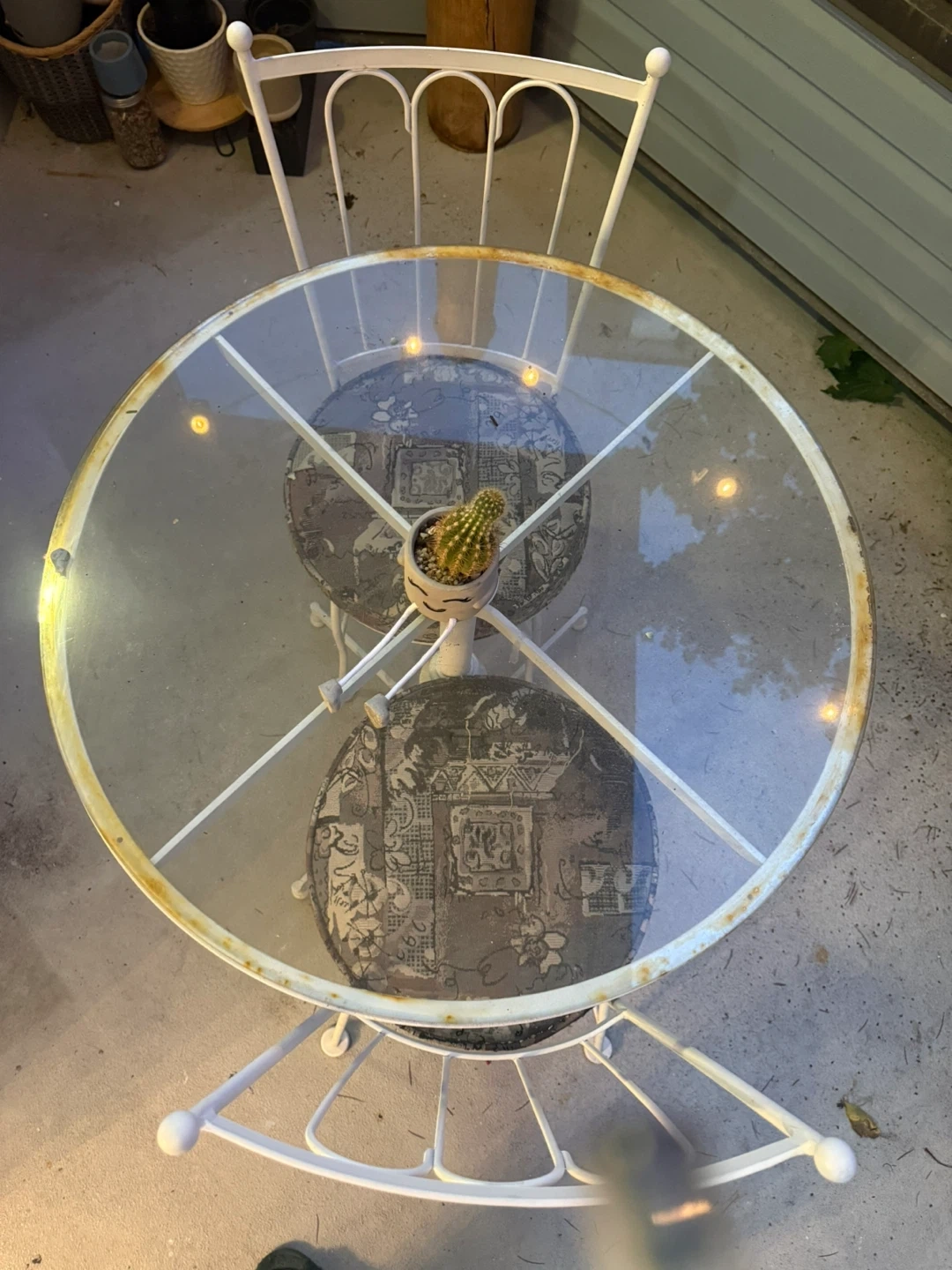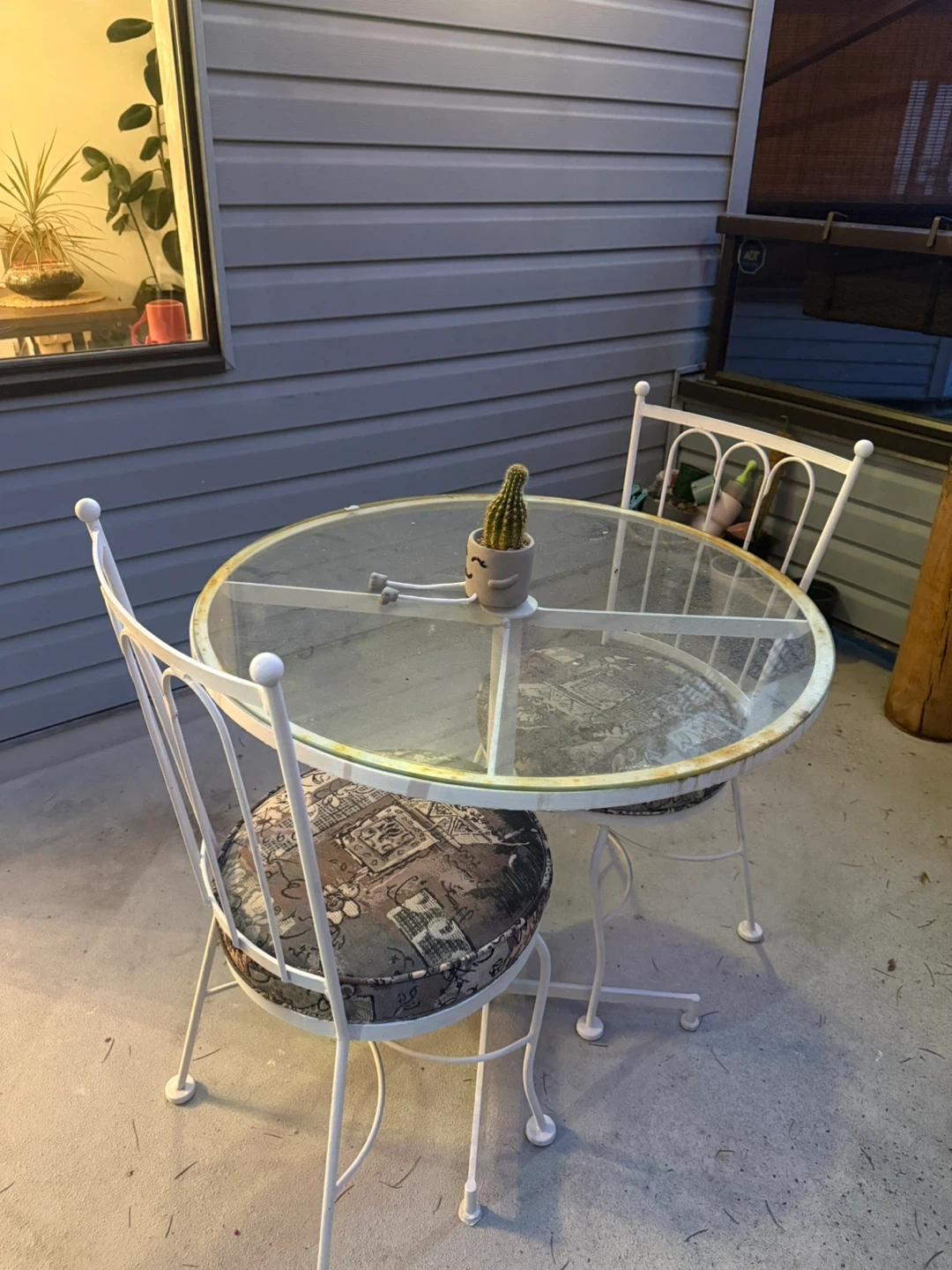 Selling a cute little outdoor patio set! It includes a round glass table (74cm diameter) and two chairs with patterned cushions. The set is white and would look great on a balcony or small patio. There are some signs of wear, but it's still a functional and charming set
