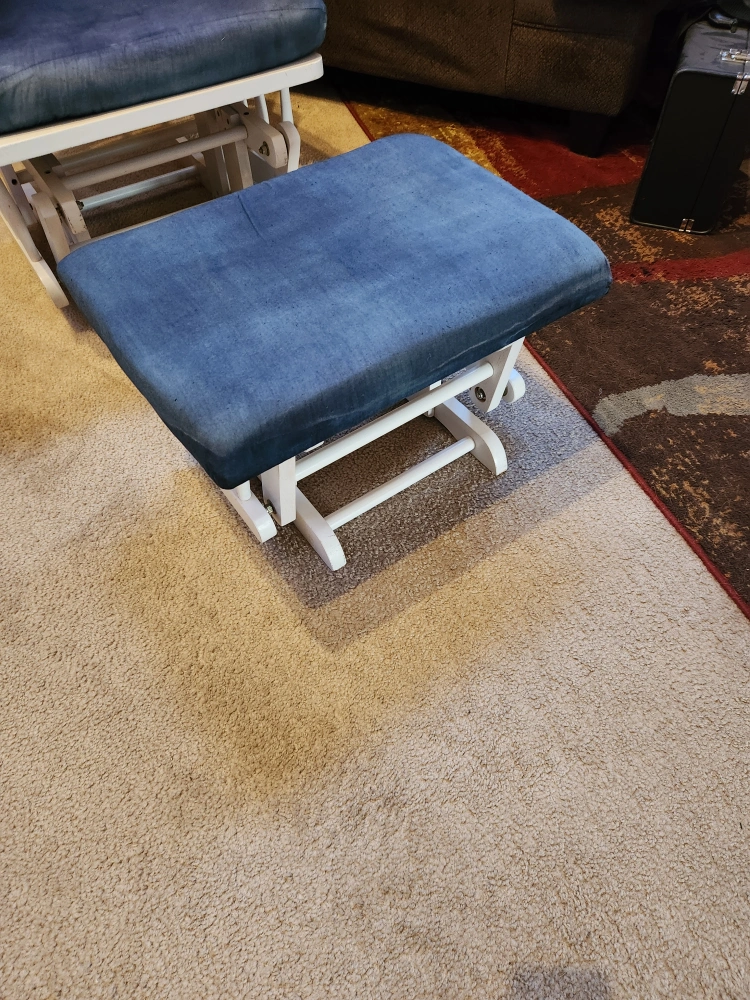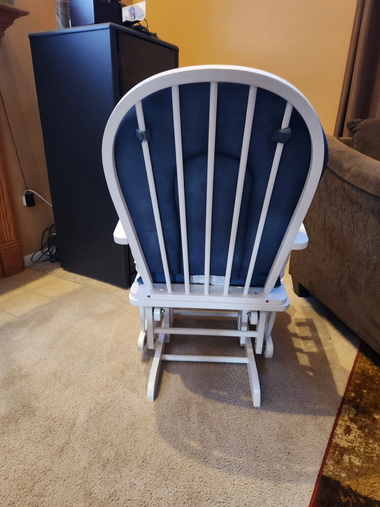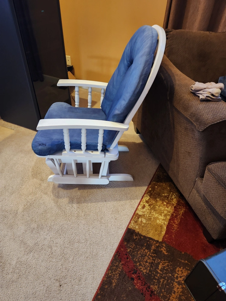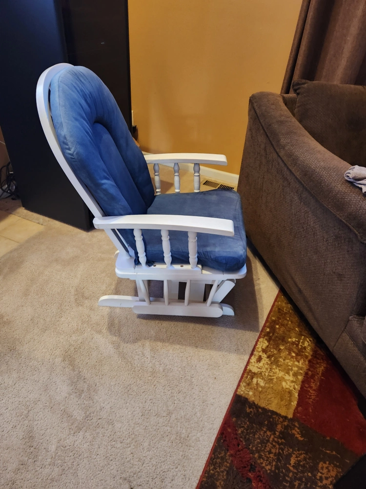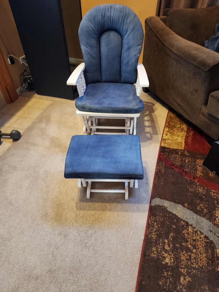 I'm selling a glider rocking chair with a matching ottoman! The chair has a white frame and blue cushions. It's in good condition and would be perfect for a nursery or living room