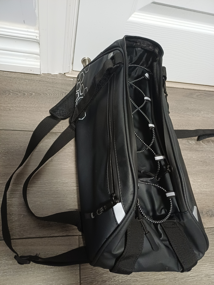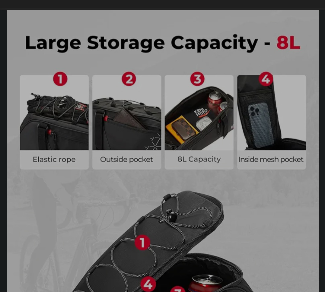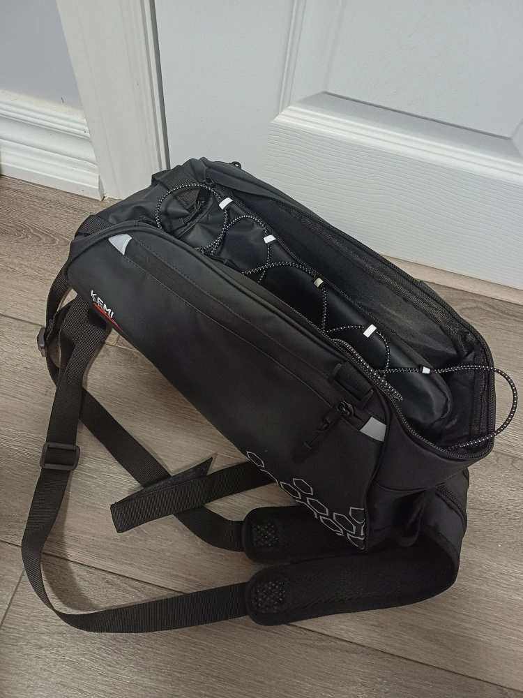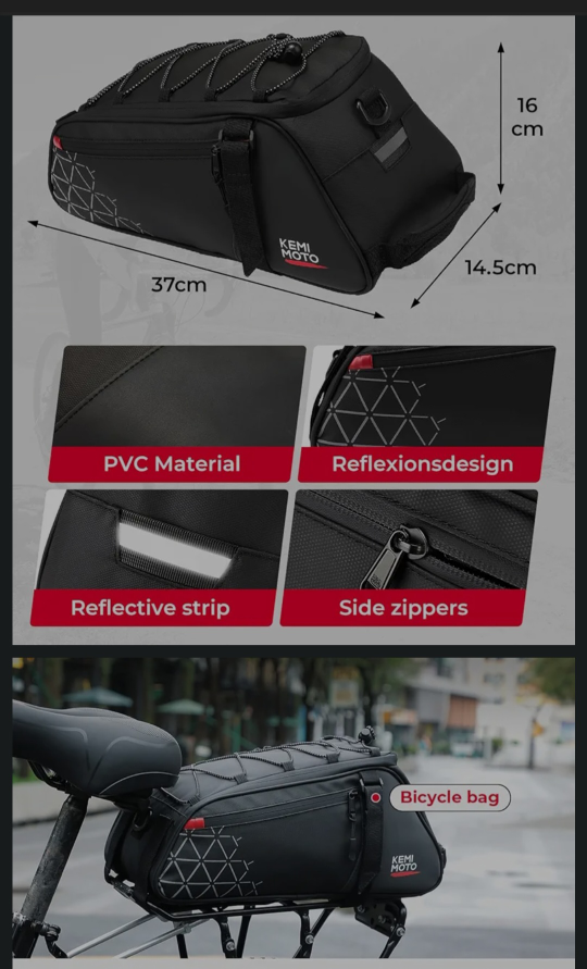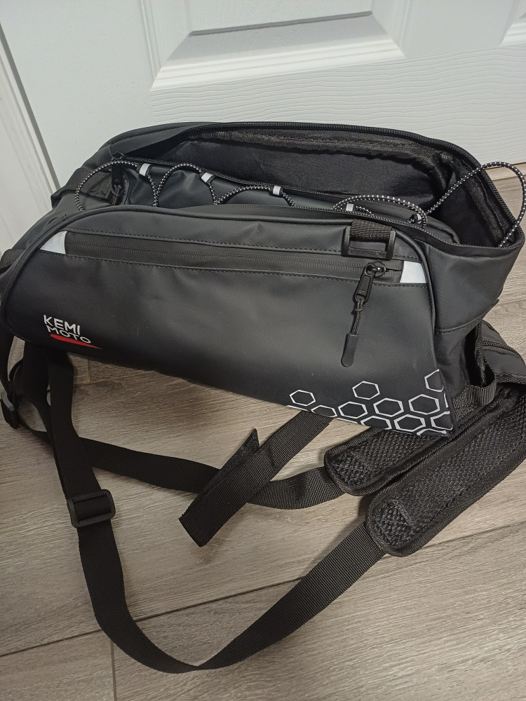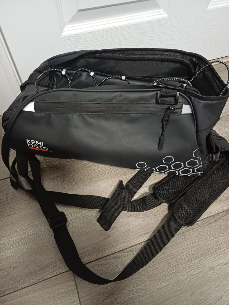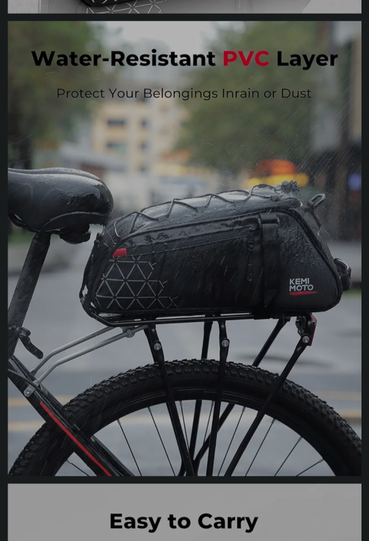 I'm selling a Brand New... KEMIMOTO bike rack bag in black! It's in super great condition and ready to go on your next ride. This bag is made with a water-resistant PVC layer to protect your belongings from rain or dust. It also features a large 8L storage capacity, including an elastic rope, outside pocket, and inside mesh pocket. Easy to carry as well!