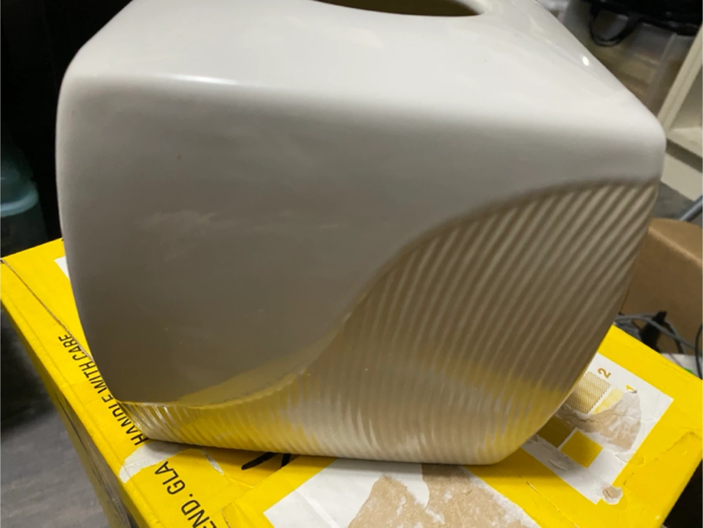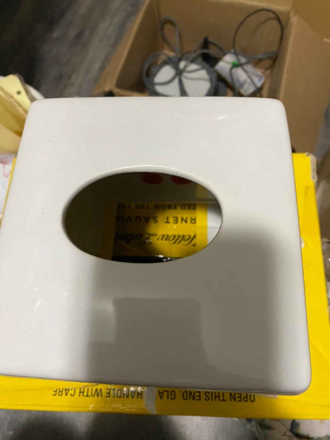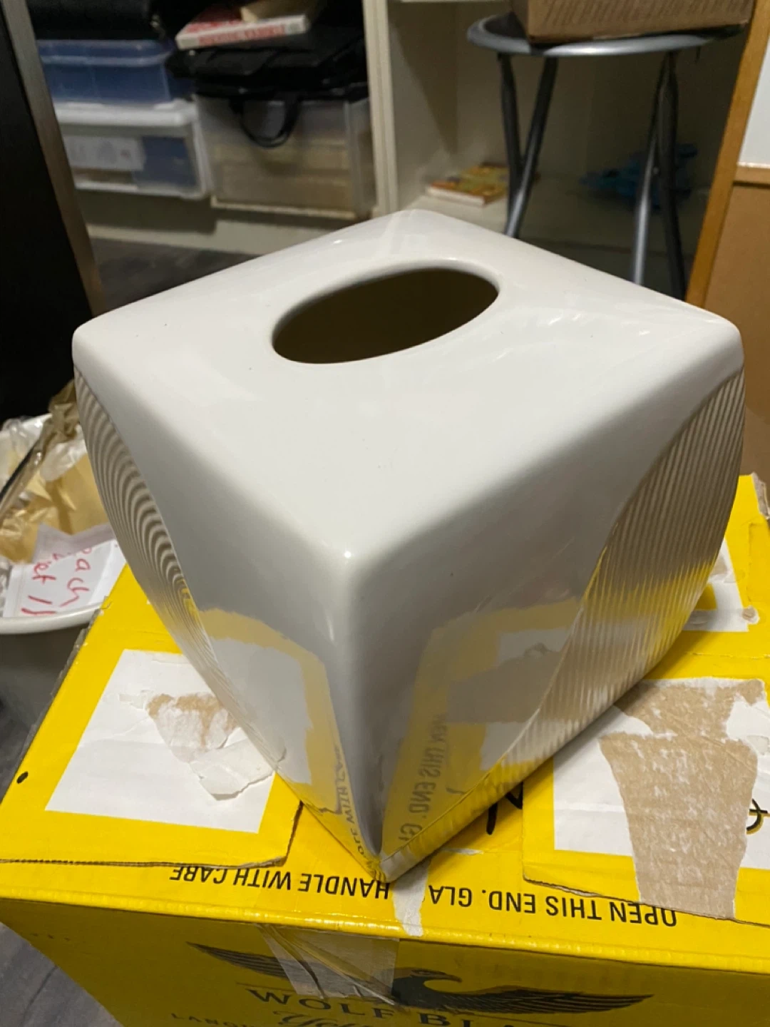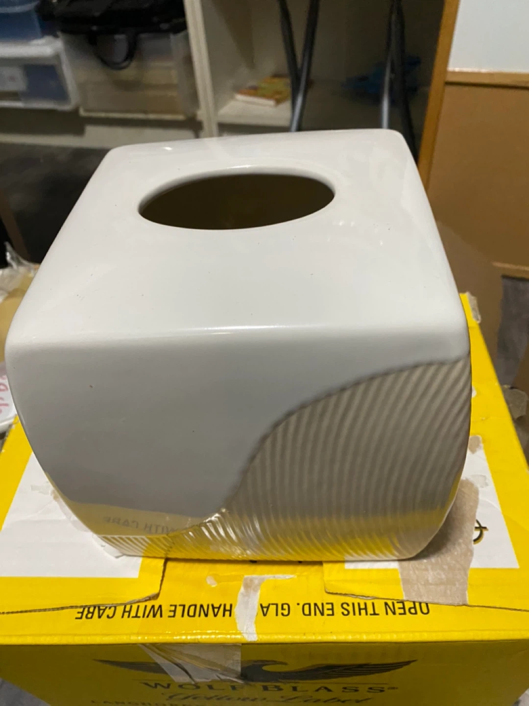 Selling a white ceramic tissue box cover. It has a square shape with rounded edges and a textured design on the sides. It's in great condition and ready to add a touch of elegance to your space