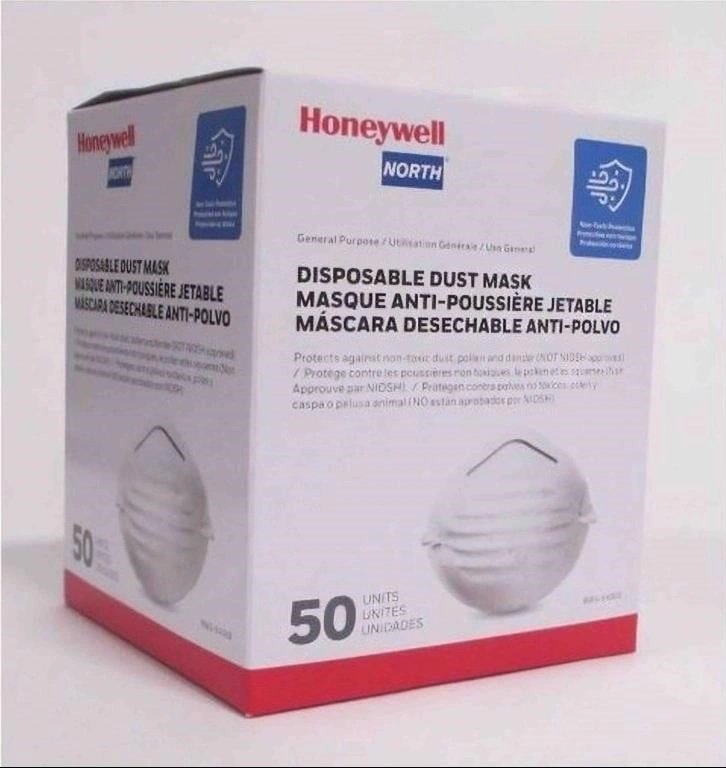 Selling a box of Honeywell North disposable dust masks. The box contains 50 units of general-purpose dust masks. Protects against non-toxic dust, pollen, and dander. Approved by NIDSH.
