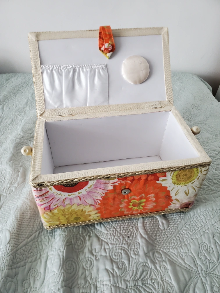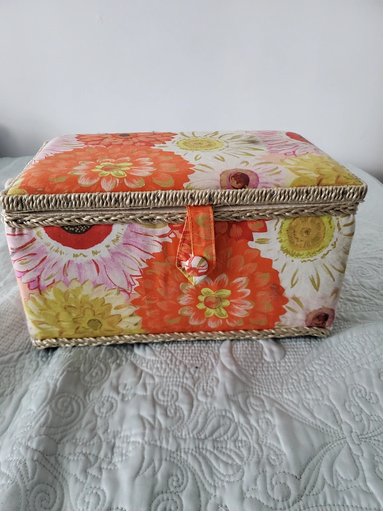 Selling a charming sewing box with a vibrant floral pattern! It's perfect for storing your sewing supplies or other small items. The box is in great condition and features a unique design with a decorative trim. Inside, you'll find compartments to help keep things organized. It's a lovely piece to add to your crafting space or as a decorative accent in your home