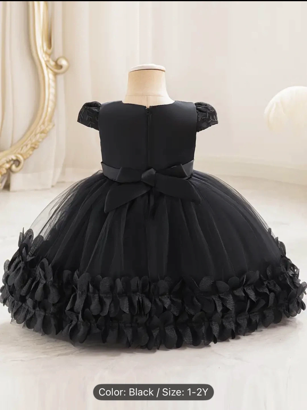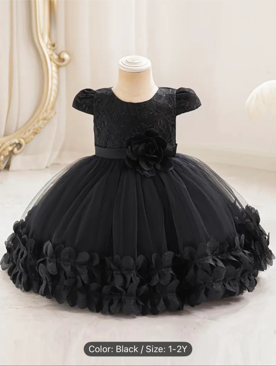 A charming black dress for your little one! It features 3D lace, ruffles, and a lovely floral design. The size is 1-2 years.
