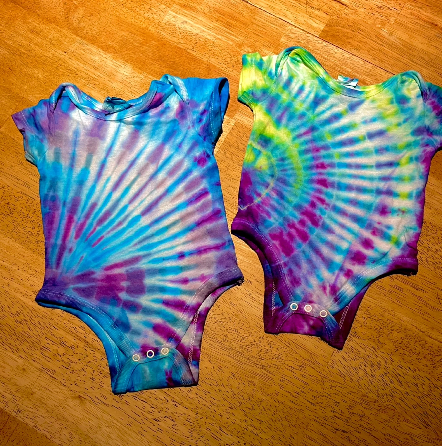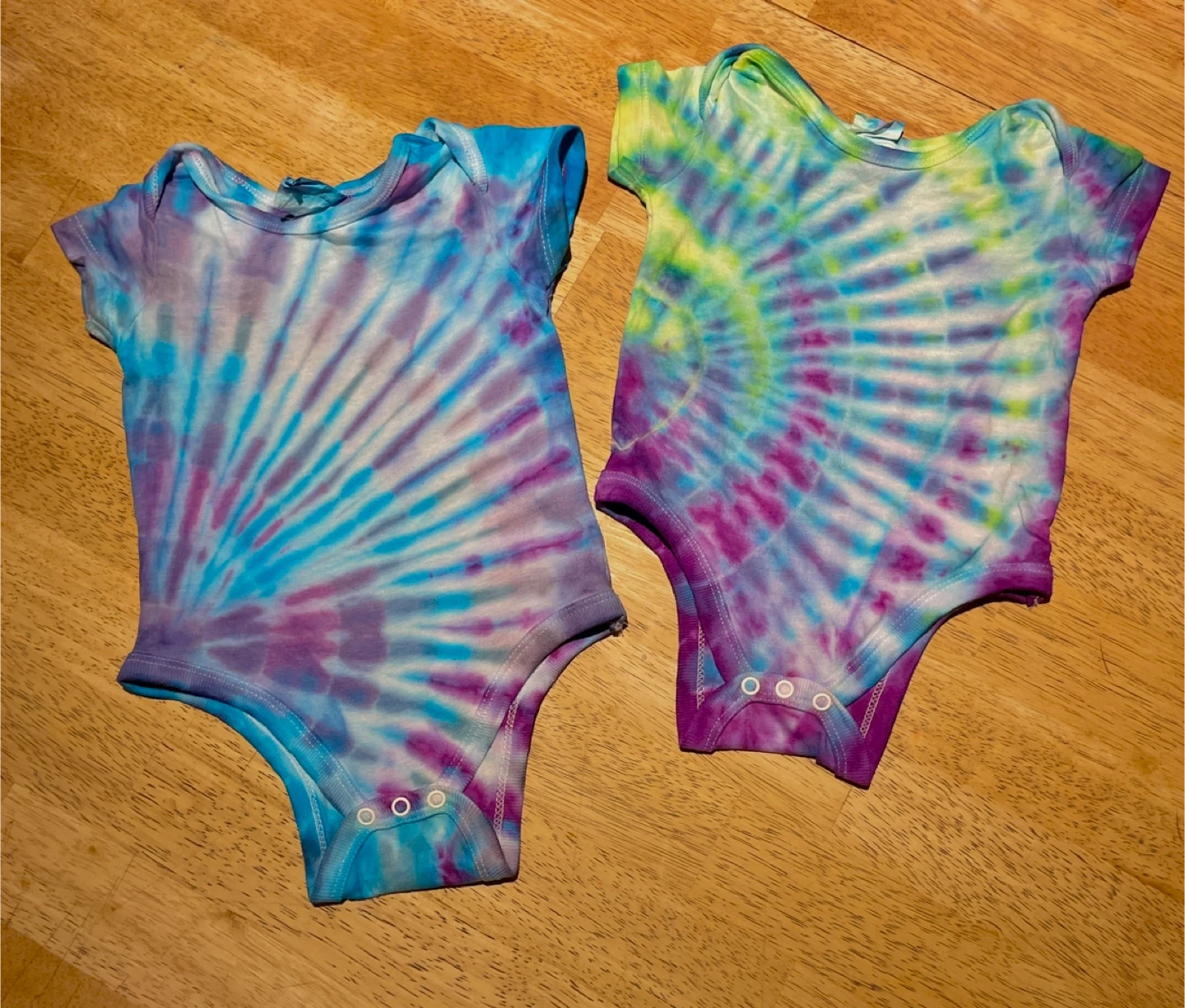 Two custom handmade tie dye baby onesies with short sleeves. They have a unique spiral design with a mix of vibrant colours, perfect for your little one! O-3 months and 3-6 months sizes. Washed with all natural baby safe detergent with no chemicals or scents, nor softeners. $10 each or $15 for the pair.