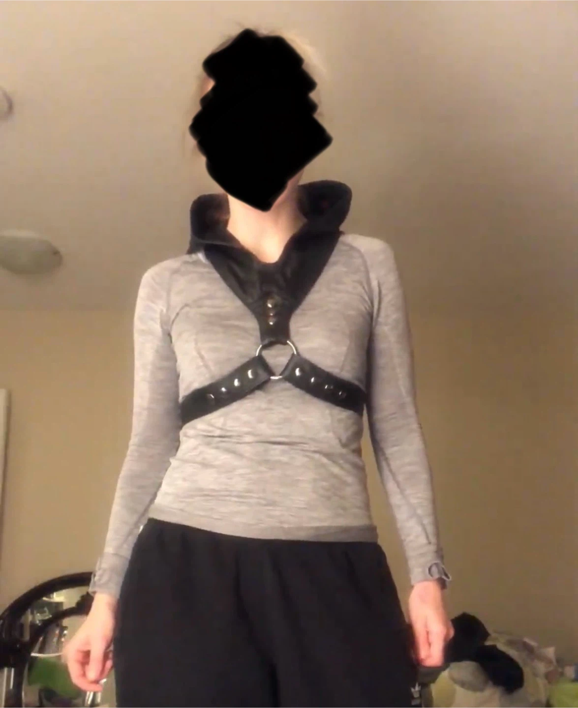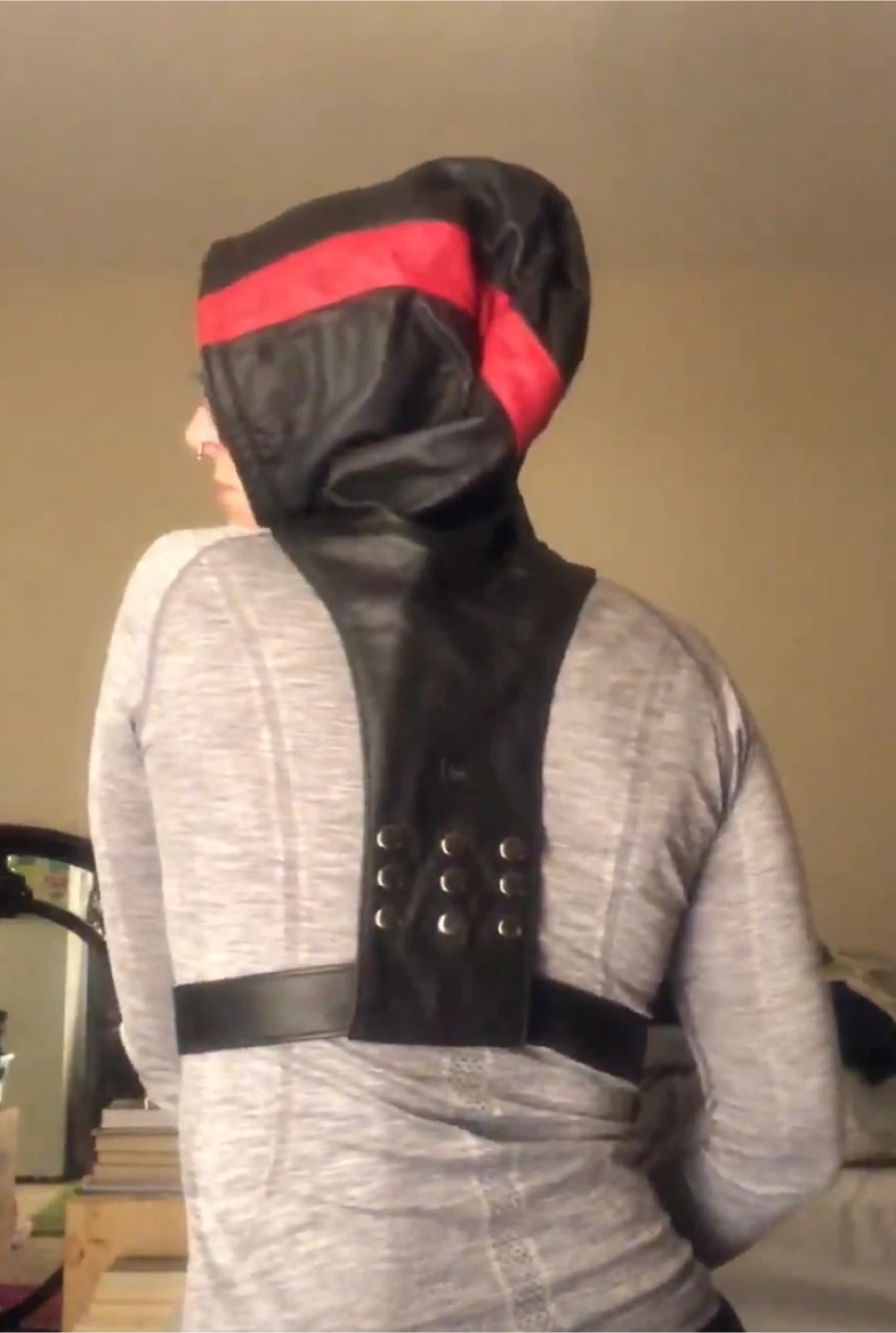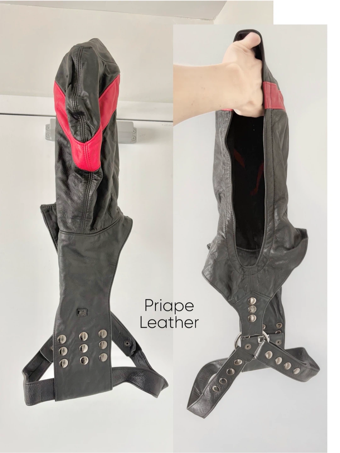 Selling a Priape leather hood in black with a red accent. It's in great condition and has a unique design with metal accents. Perfect for adding a bold touch to your wardrobe!