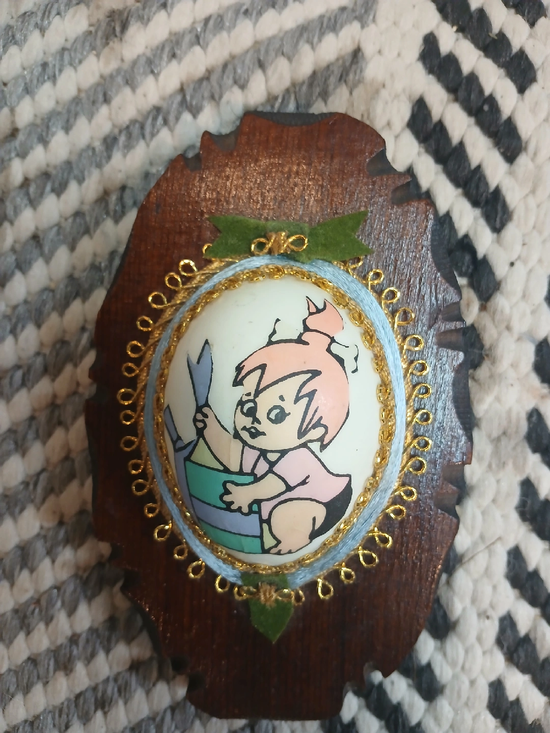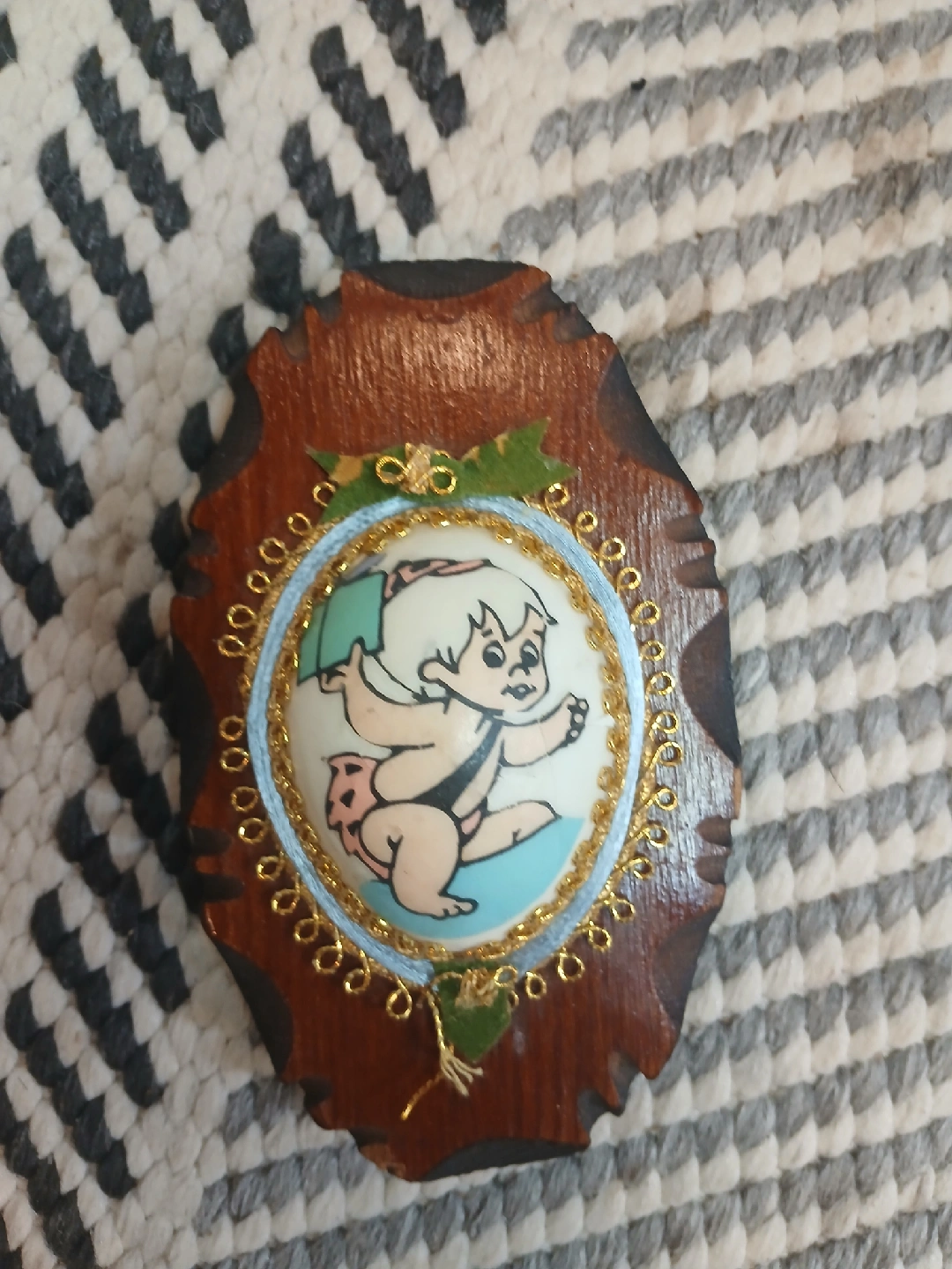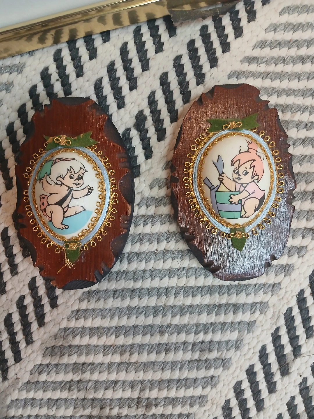 Selling a framed Vintage picture of The Flintstones cartoon characters along with two wooden wall decor pieces featuring baby Pebbles and Bamm-Bamm. 24" x 18 1/2" Picture 30 1/2 "x 25" Framed