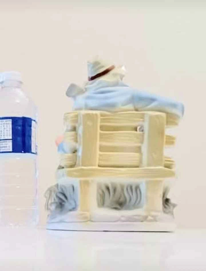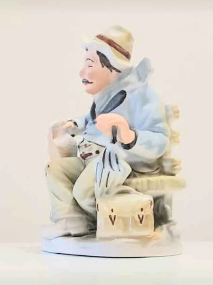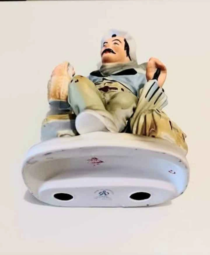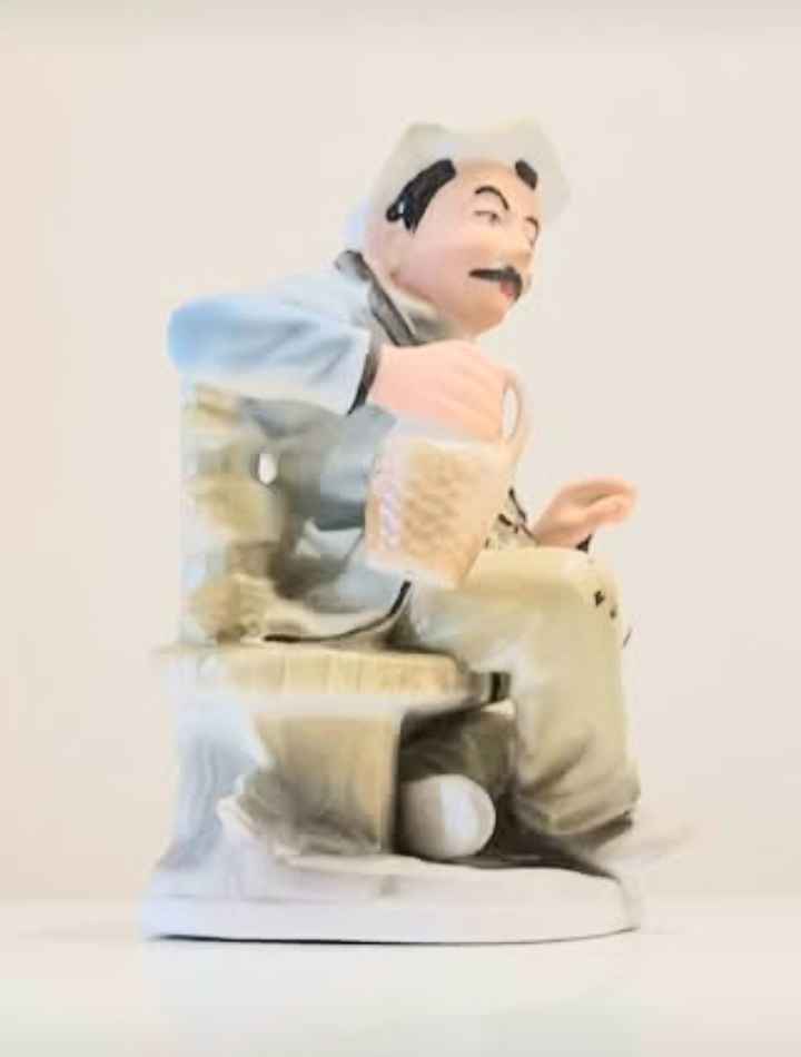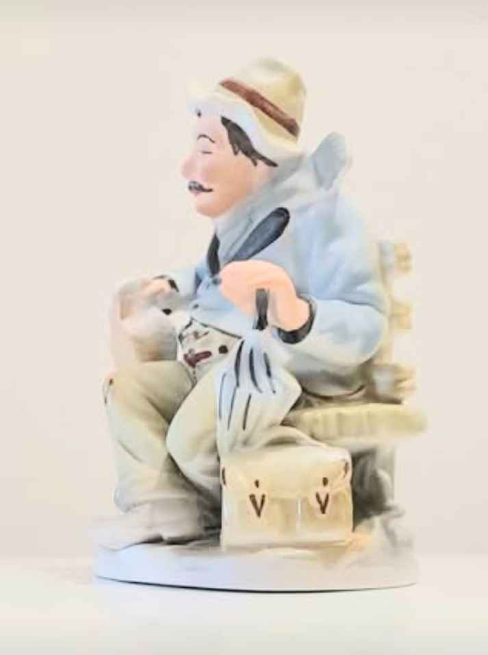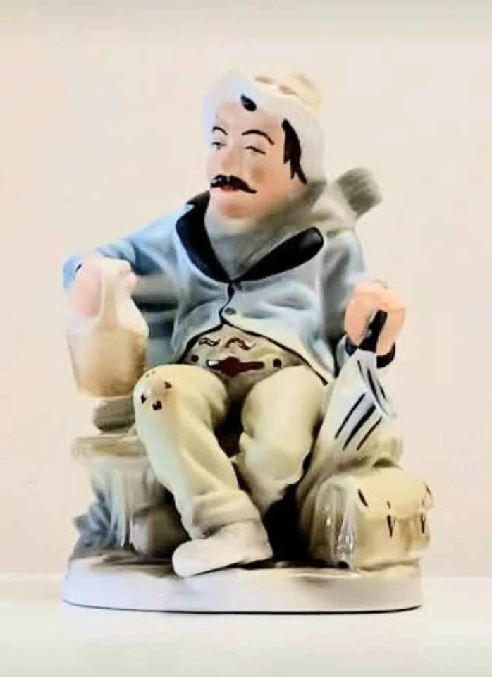 The figurine shows a man with a mustache, wearing a hat and a light blue jacket, sitting on a bench. He is holding a jug in one hand and a satchel or bag in the other.