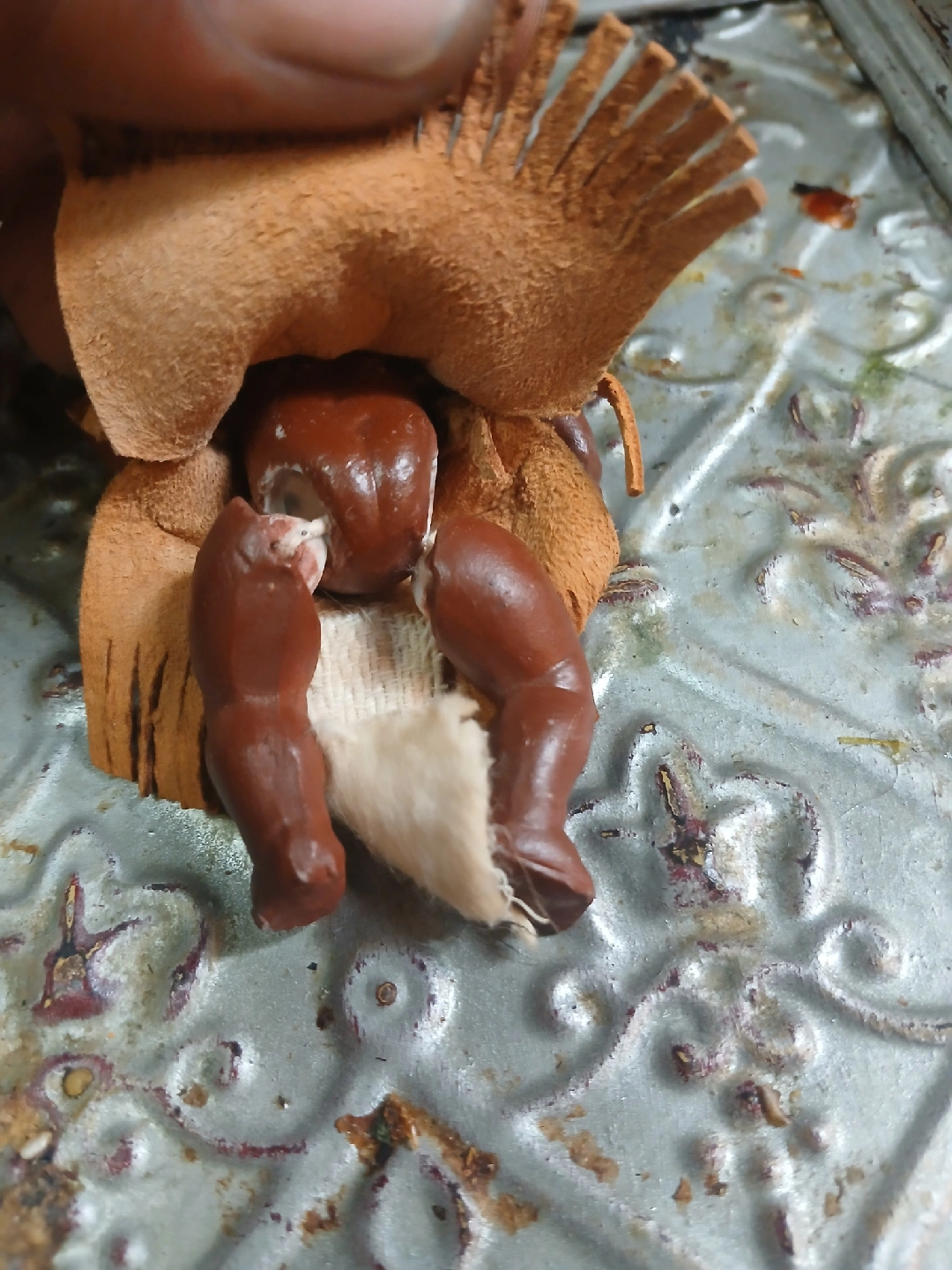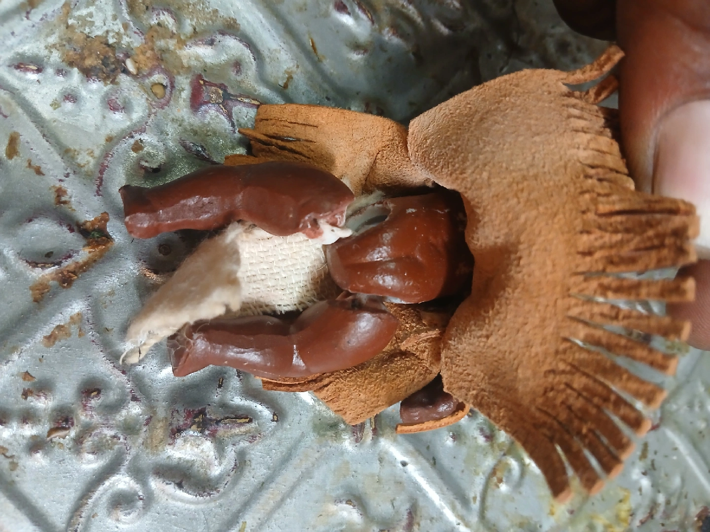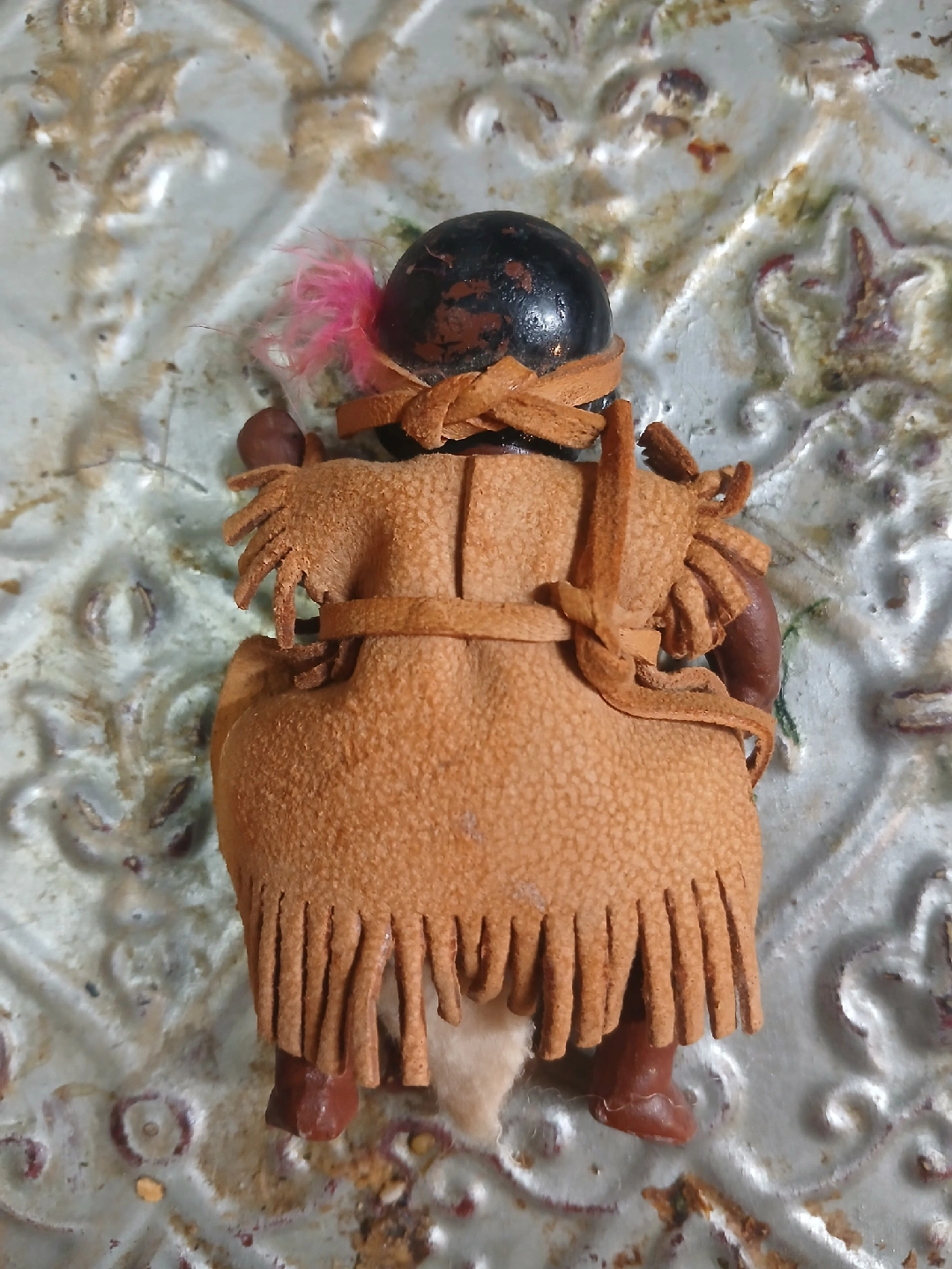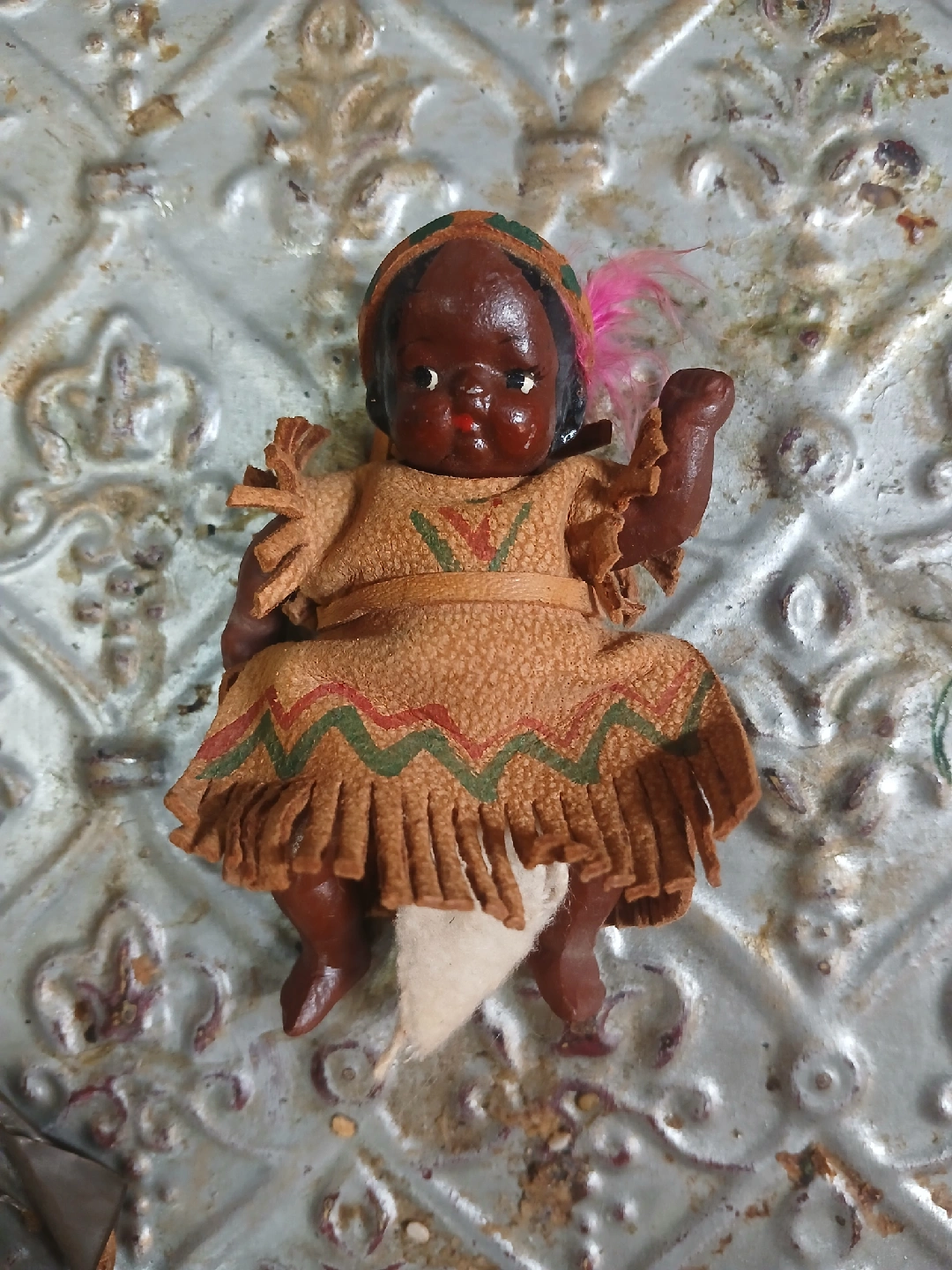 This is a vintage doll in a Native American style dress. It shows signs of wear and tear, as shown in the photos. It would be a great addition to a collection or for display