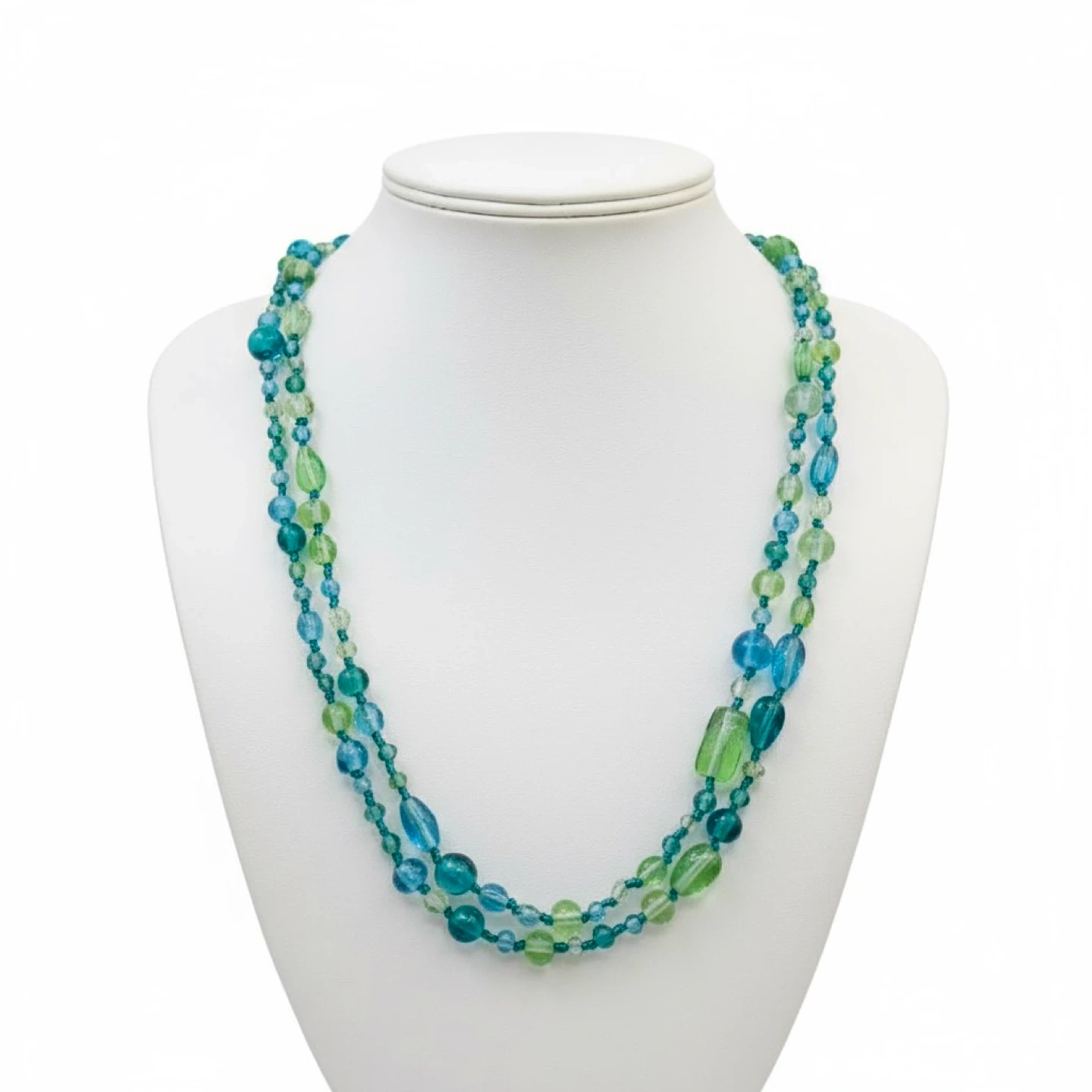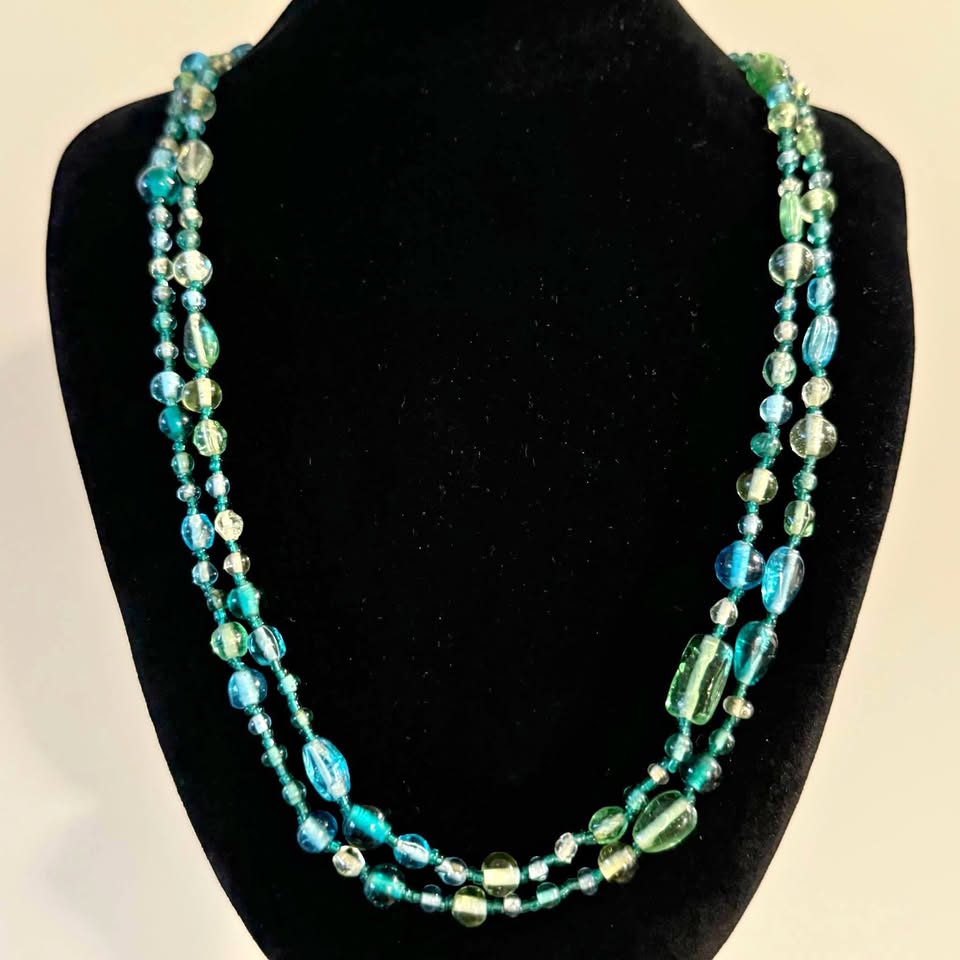The item is in lovely vintage condition. Long station necklace with what looks like lucite beads in beautiful shades of blue, teal, turquoise, sea foam—no brand markings noted. Beads are translucent and look like hard candies. Style this piece in multiple ways (wear long or wrap around multiple times). No clasp on this piece/pullover style. Please see photos and let me know if you have any questions.