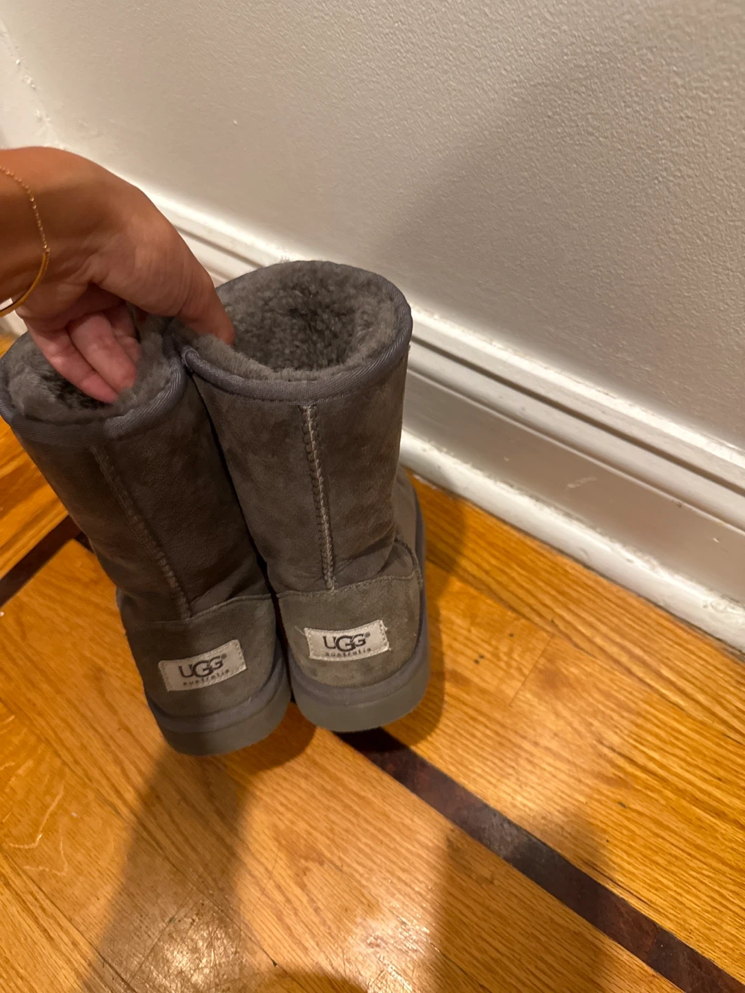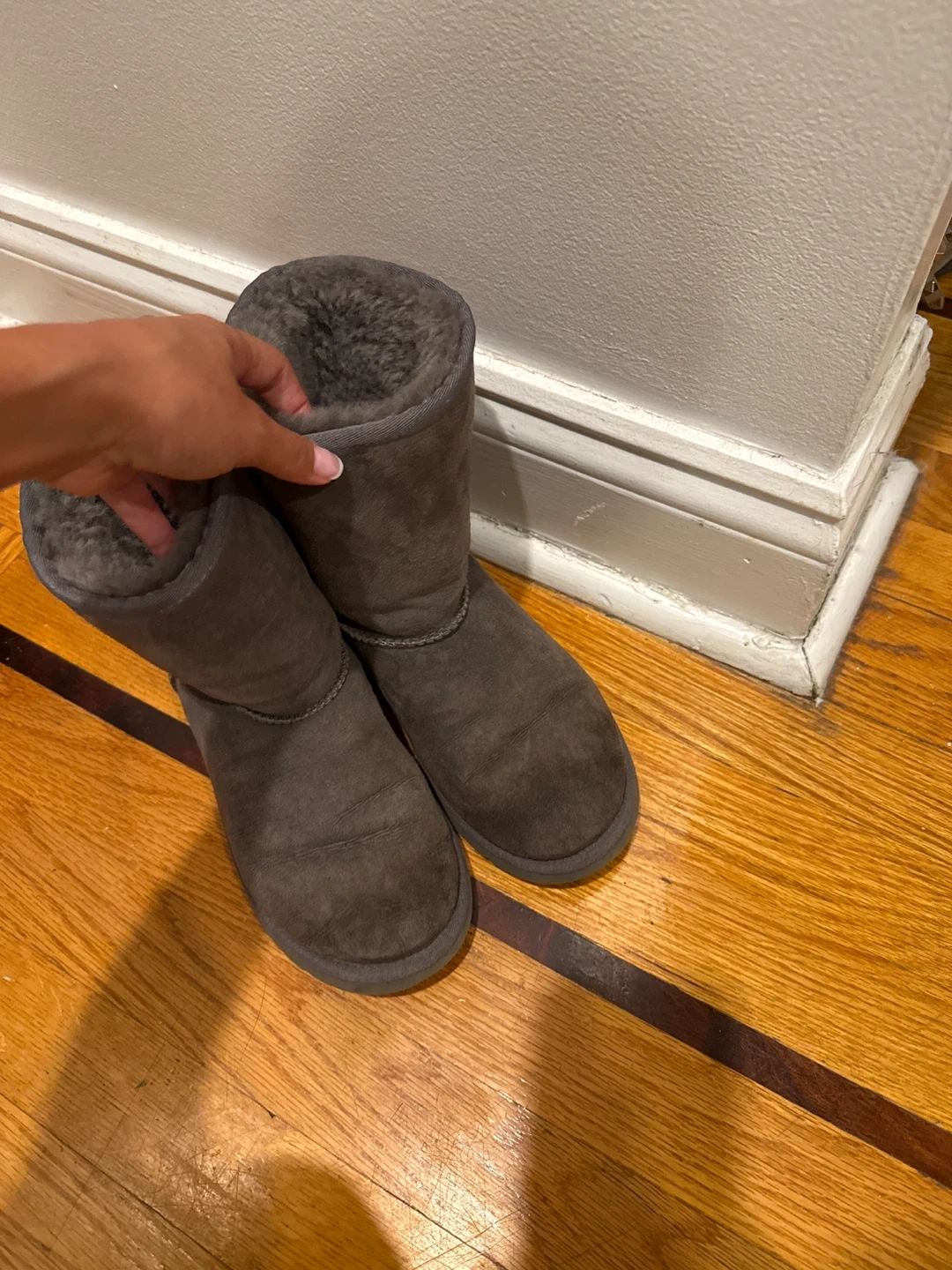 Selling a pair of UGG Classic Short II boots in gray! They are in good condition and super cozy. These are a size 4 and perfect for the colder weather