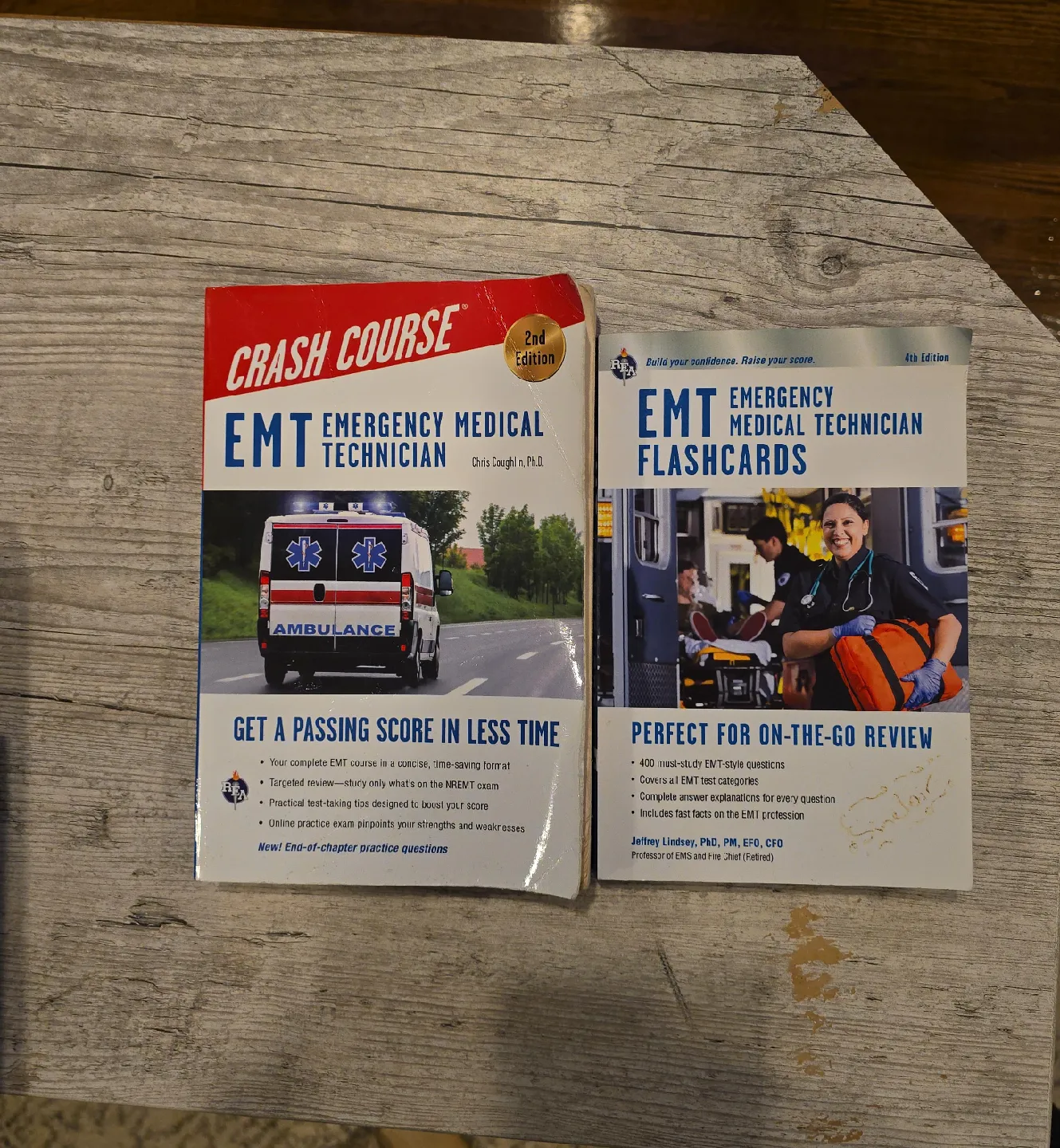 I have two EMT Emergency Medical Technician books for sale. One is a Crash Course 2nd edition and the other is a 4th edition flashcards book. Perfect for anyone studying to become an EMT