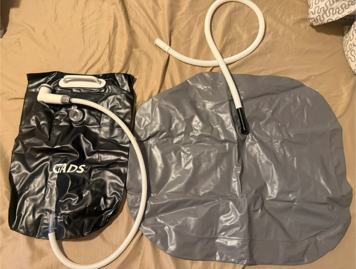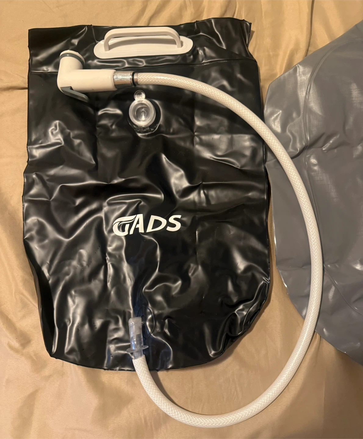 Selling a Gads 2.5 GL bedside shower water bag in black! This portable camping shower is designed for hair washing in bed or use with an inflatable shampoo basin.