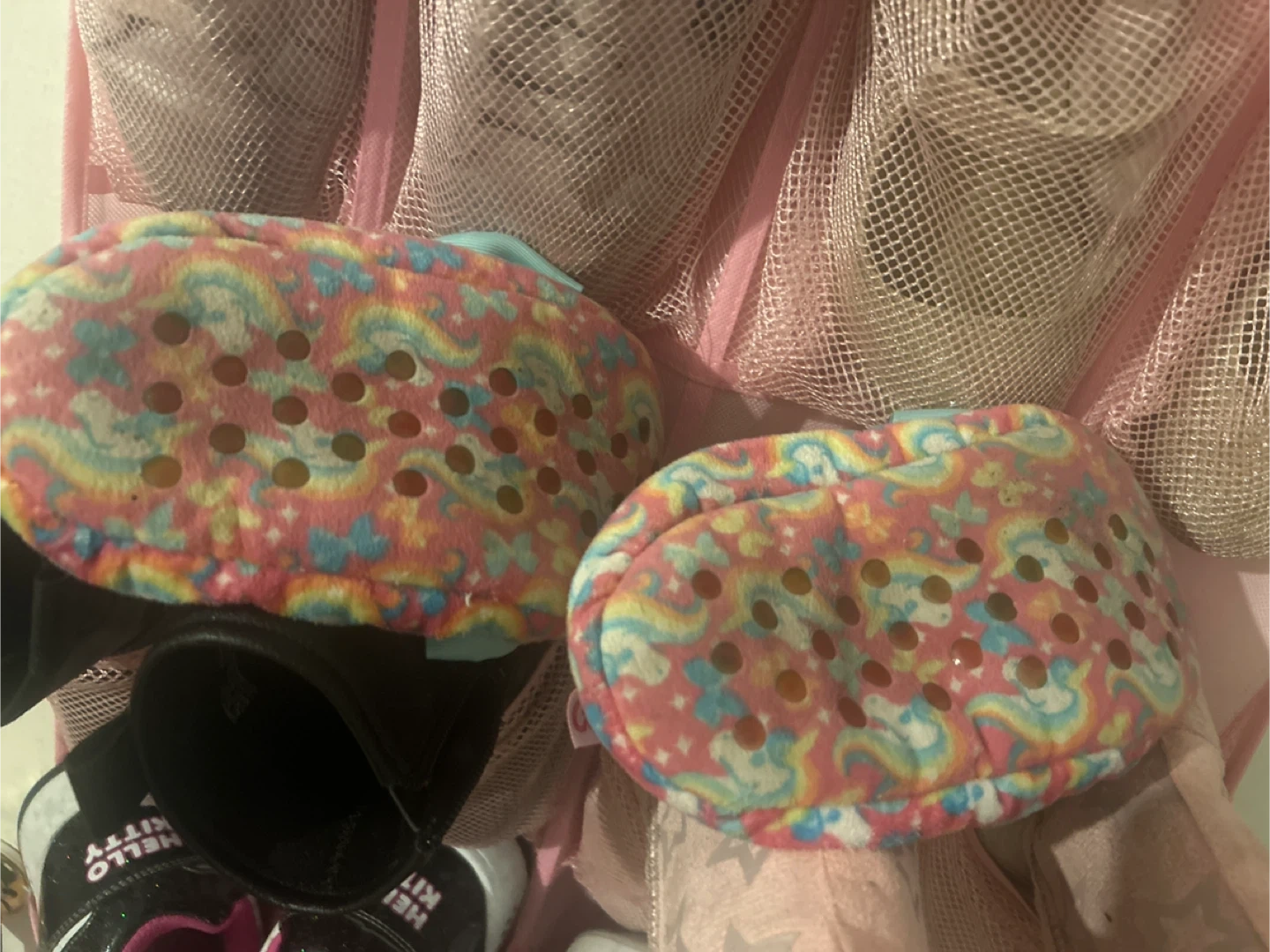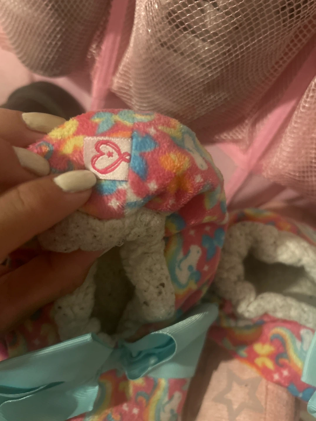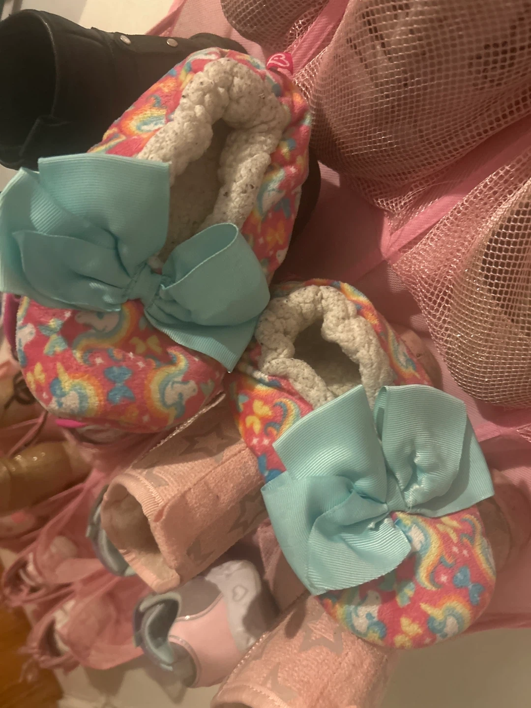 These adorable slippers feature a colorful unicorn pattern and a cute blue bow! They're super cozy and perfect for lounging around the house. The brand is JoJo Siwa