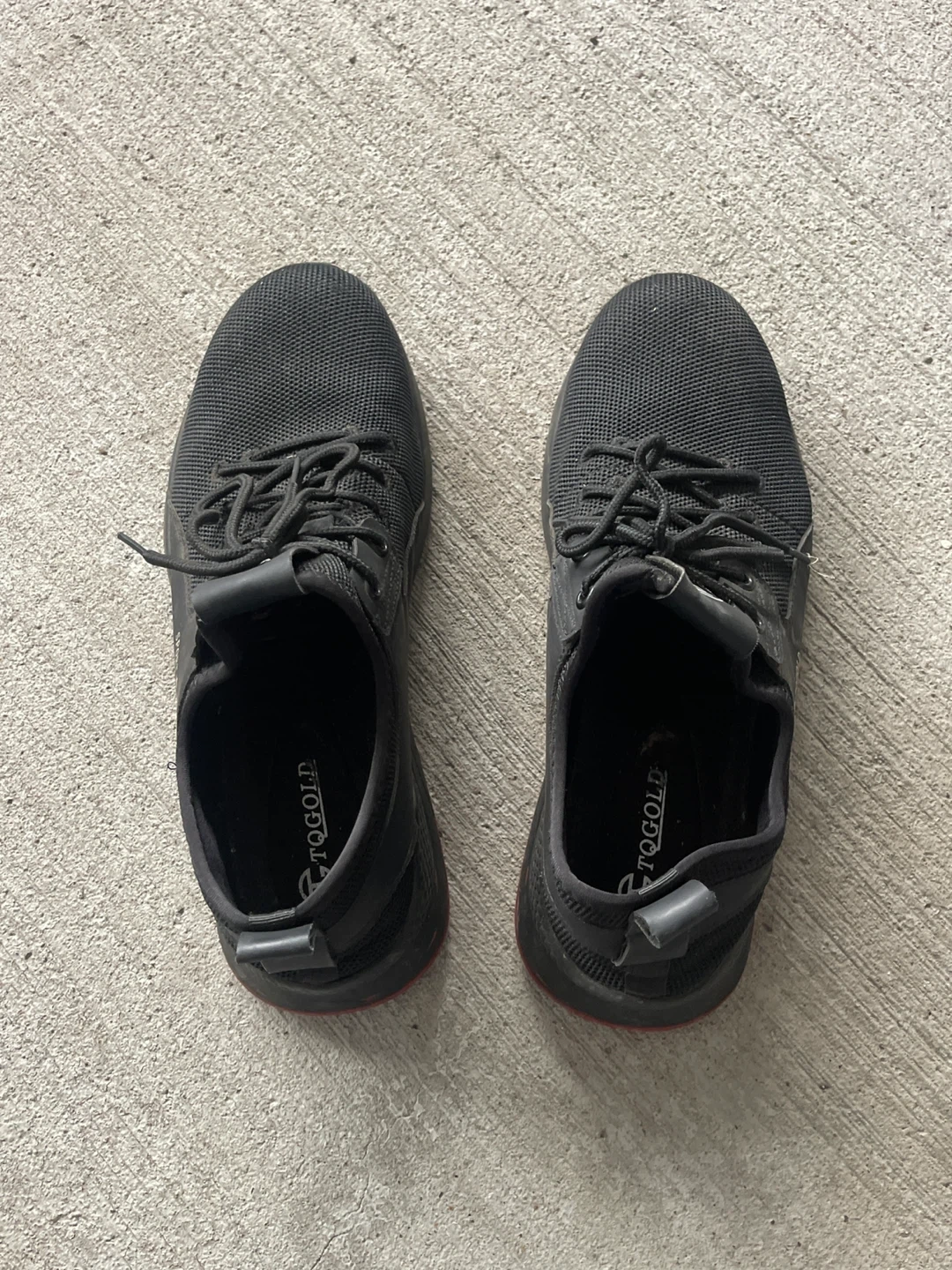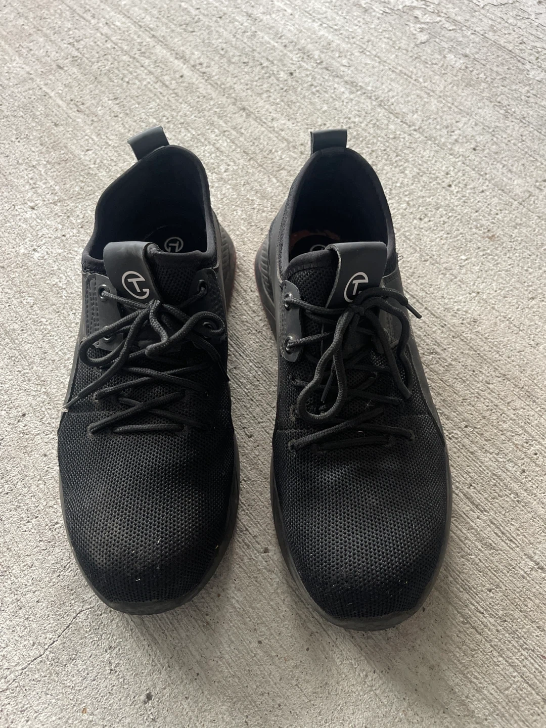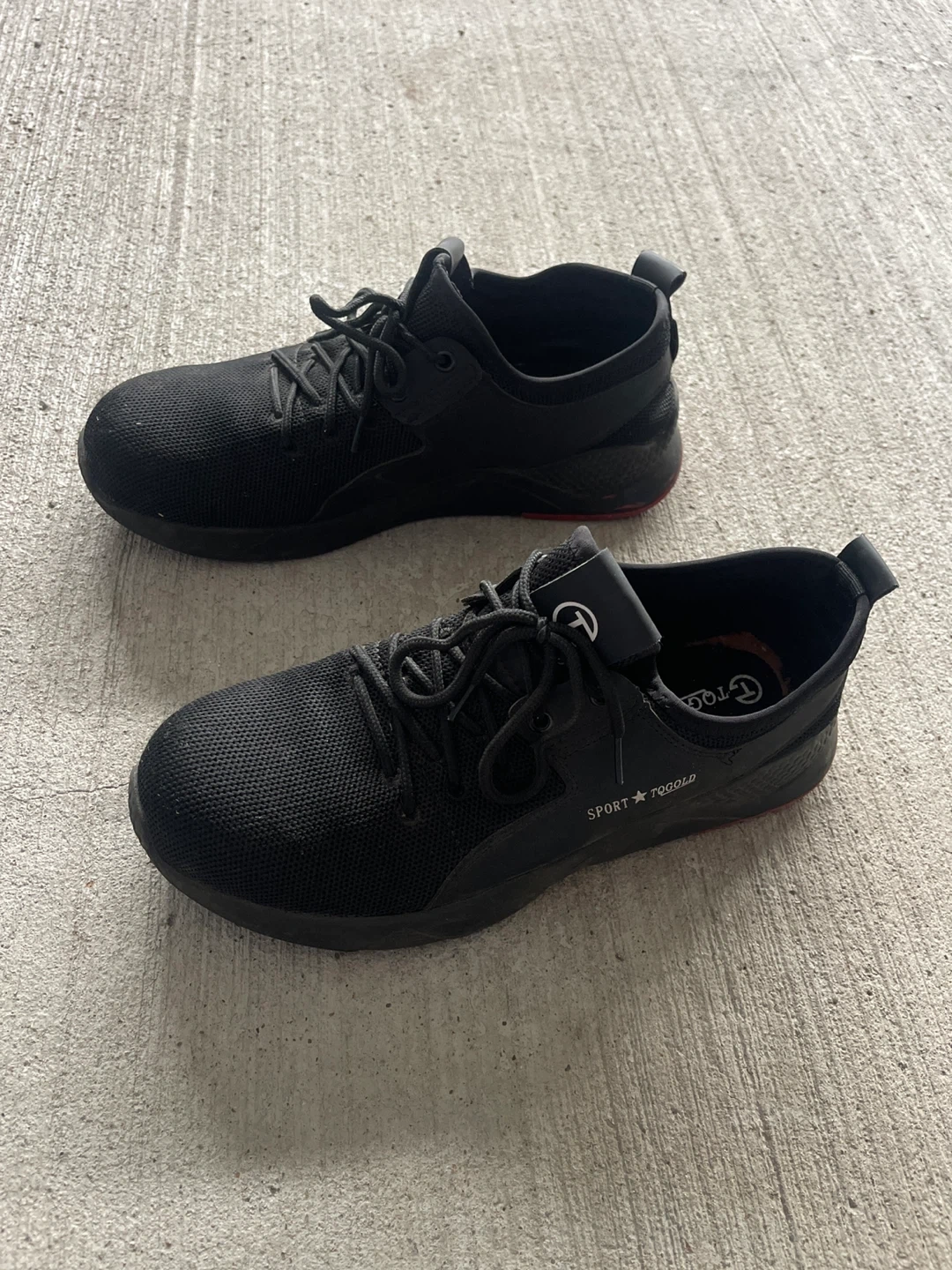 Selling a pair of TQGOLD Sport Steel Toe work shoes in black! They are in good condition and are a size 43, which is approximately a US size 9.5.