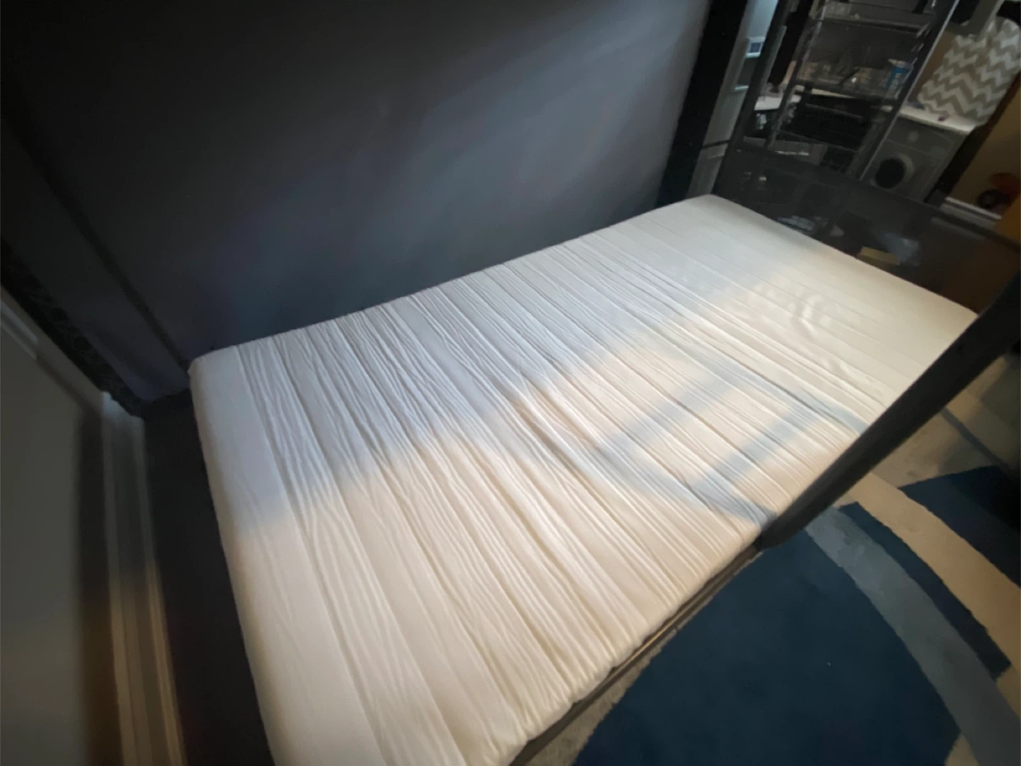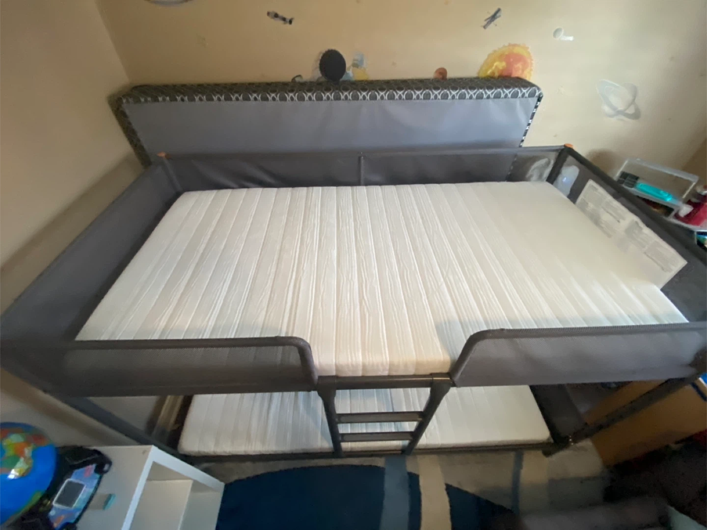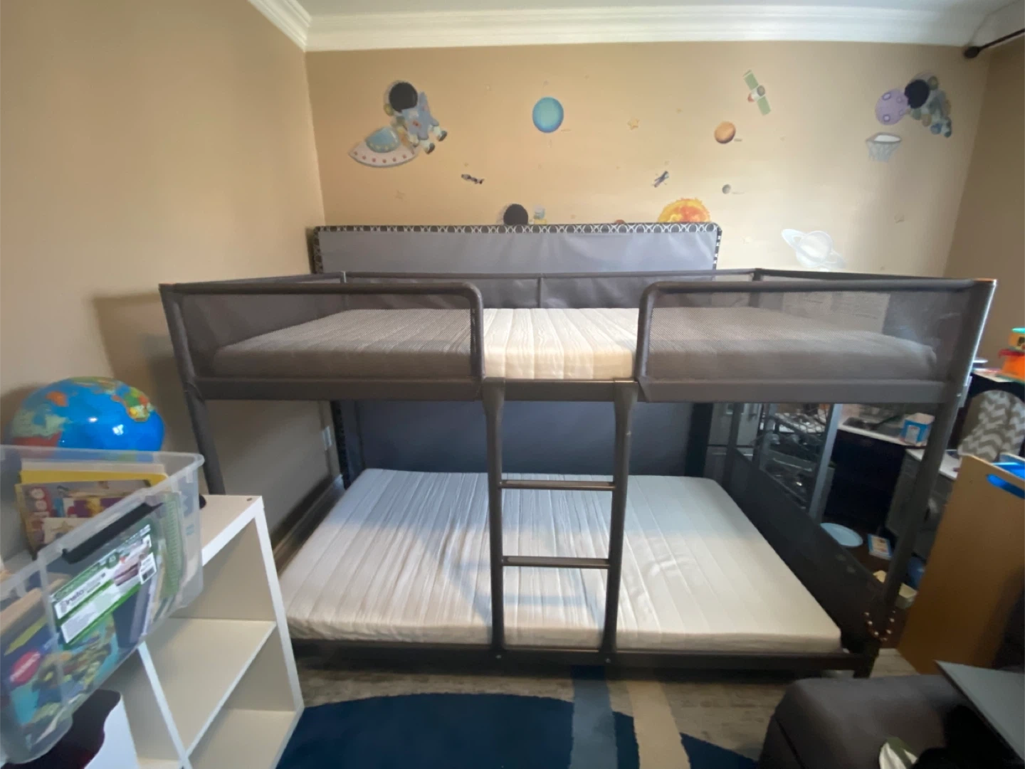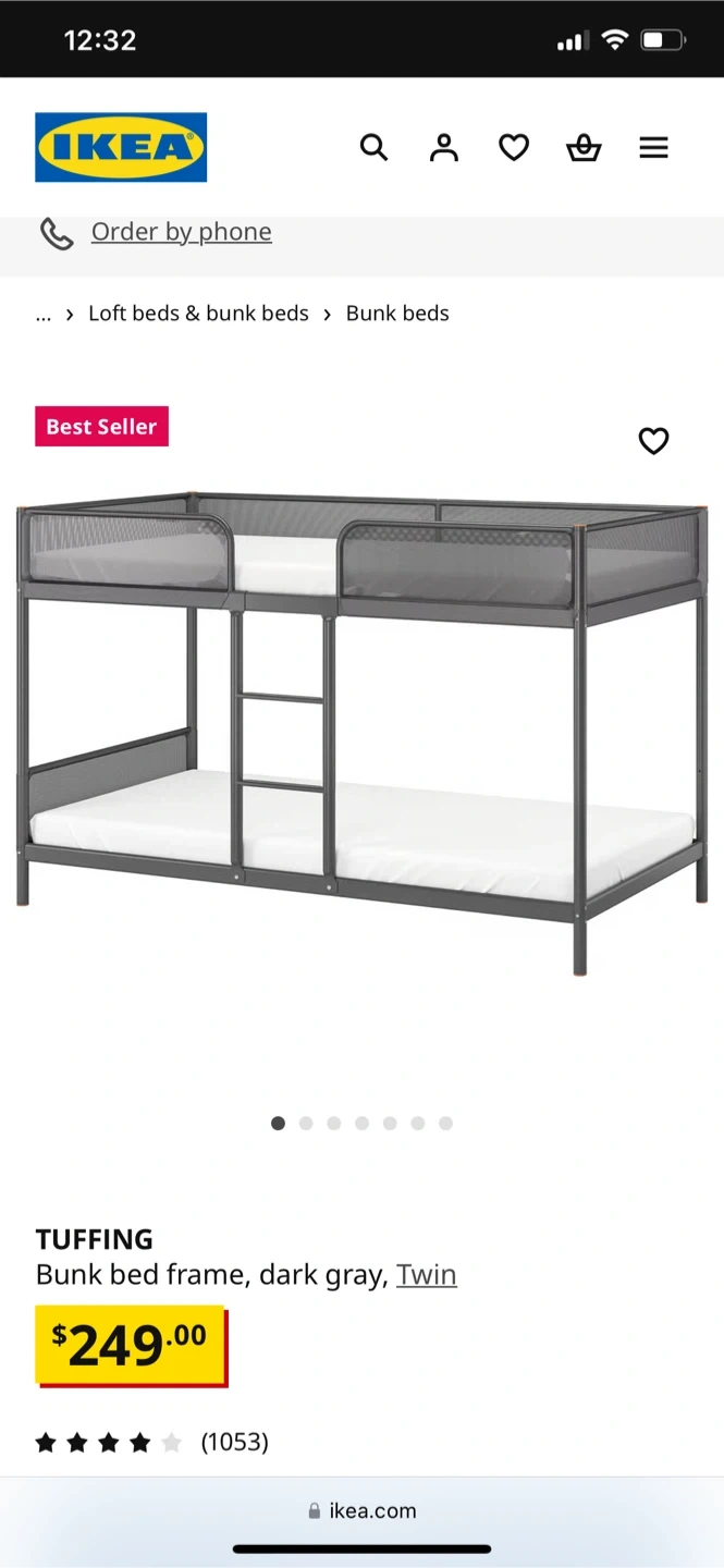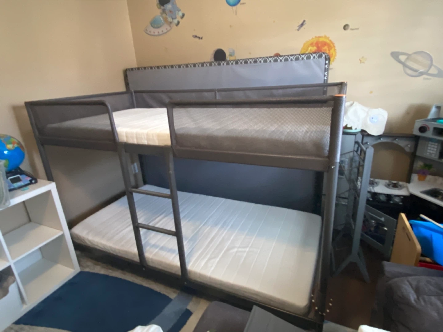 Selling an IKEA TUFFING bunk bed frame in dark grey with both mattresses, probably slept in twice my child doesn’t like it - no stains or smells. It's a twin size and in good condition. Perfect for kids' rooms or small spaces!