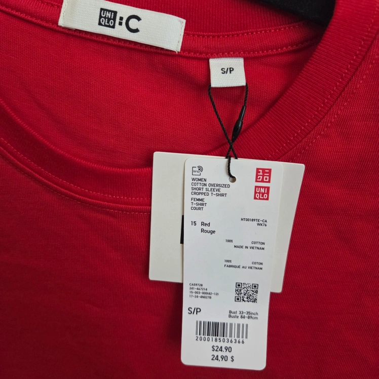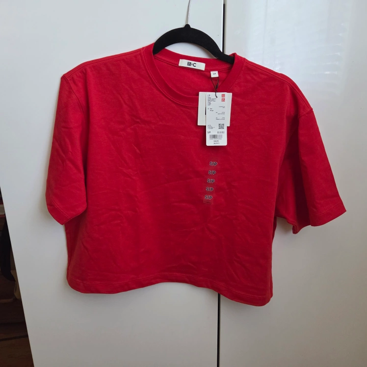 Selling a Uniqlo C women's cotton oversized cropped t-shirt in red, size small (S/P). It's made of 100% cotton.