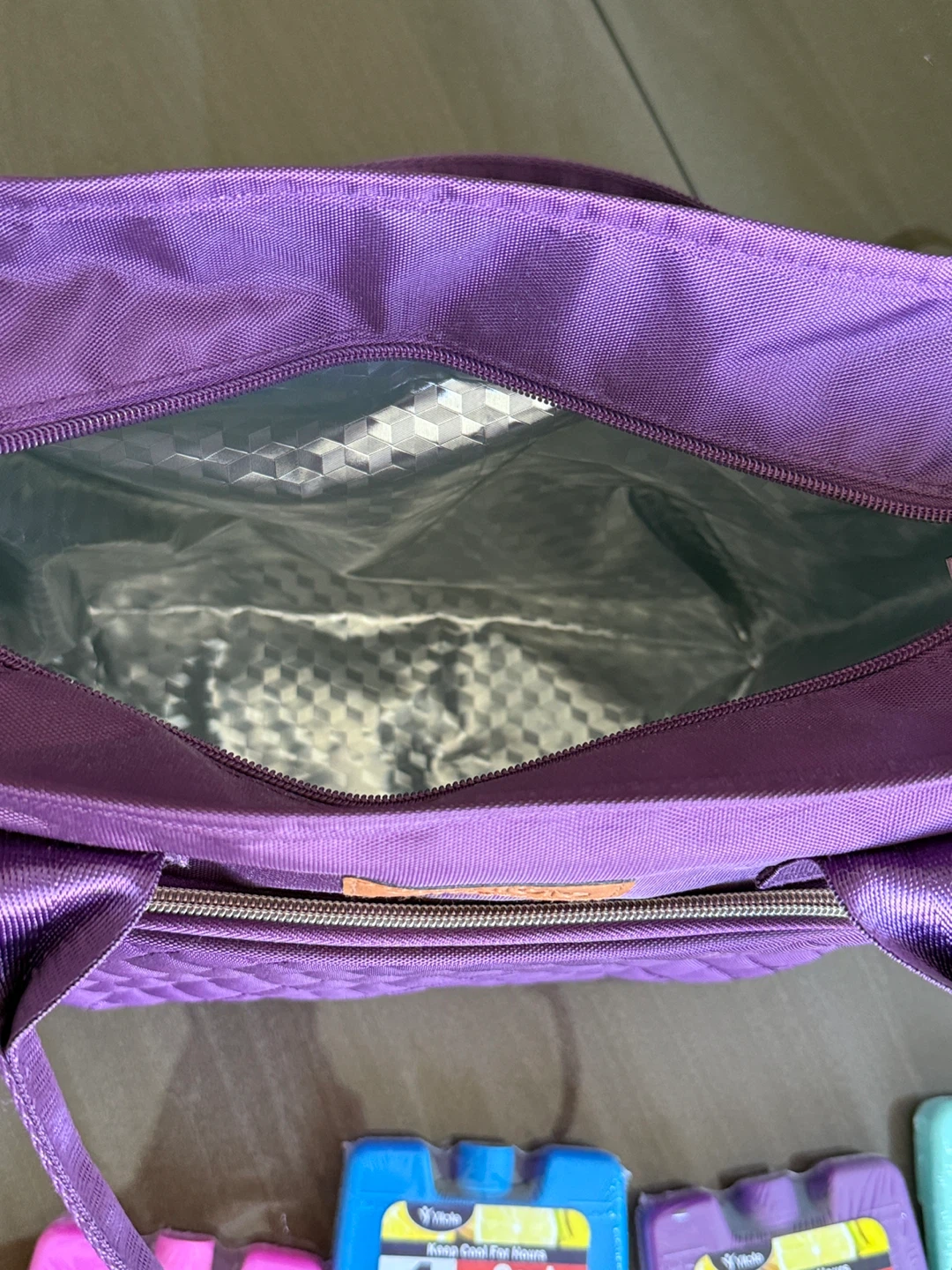 Selling a brand new Yitole diaper bag in a lovely purple colour! It comes with 4 cool packs to keep things fresh. Perfect for keeping baby bottles and snacks cool on the go. The bag has a quilted front pocket and lots of room inside