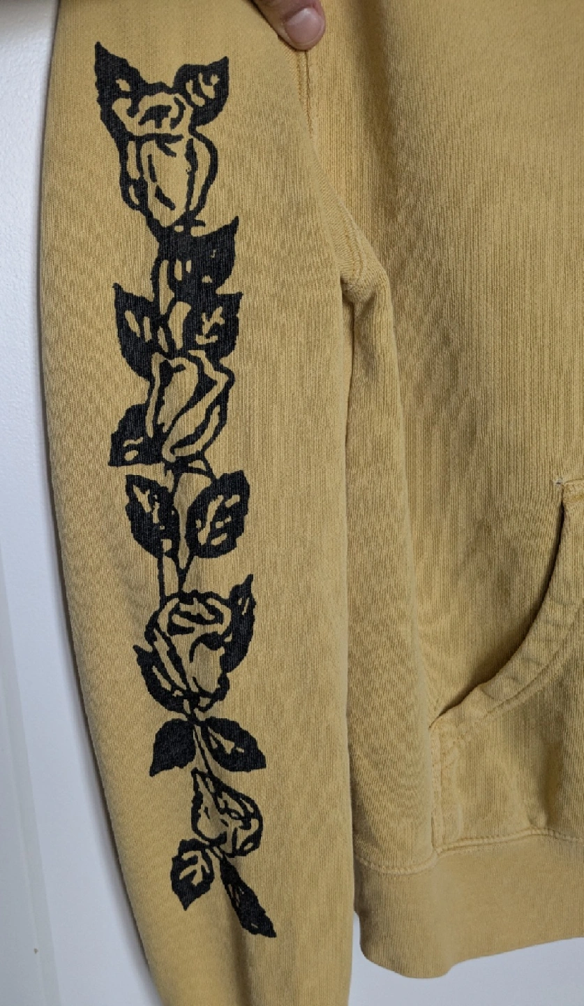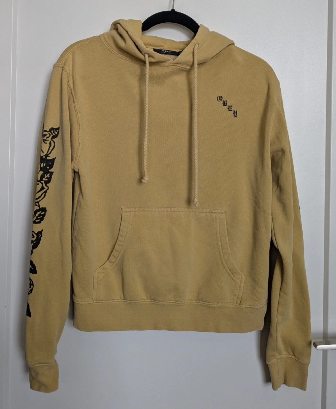 Selling a yellow Obey Worldwide hoodie in size small! It's in great condition with obey lettering on the front, and black rose design on the sleeves. Perfect for fall and layering in winter with a thicker hood!