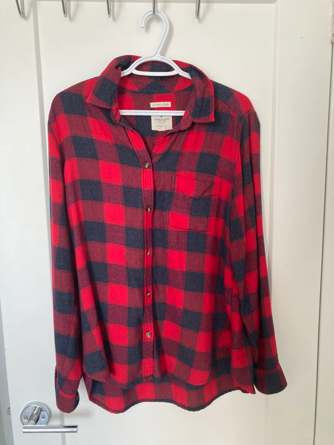 Cozy up in this American Eagle flannel! It's a size large with a boyfriend fit, perfect for a relaxed and comfy look. The classic red and black plaid pattern is always in style. Great for layering or wearing on its own!
