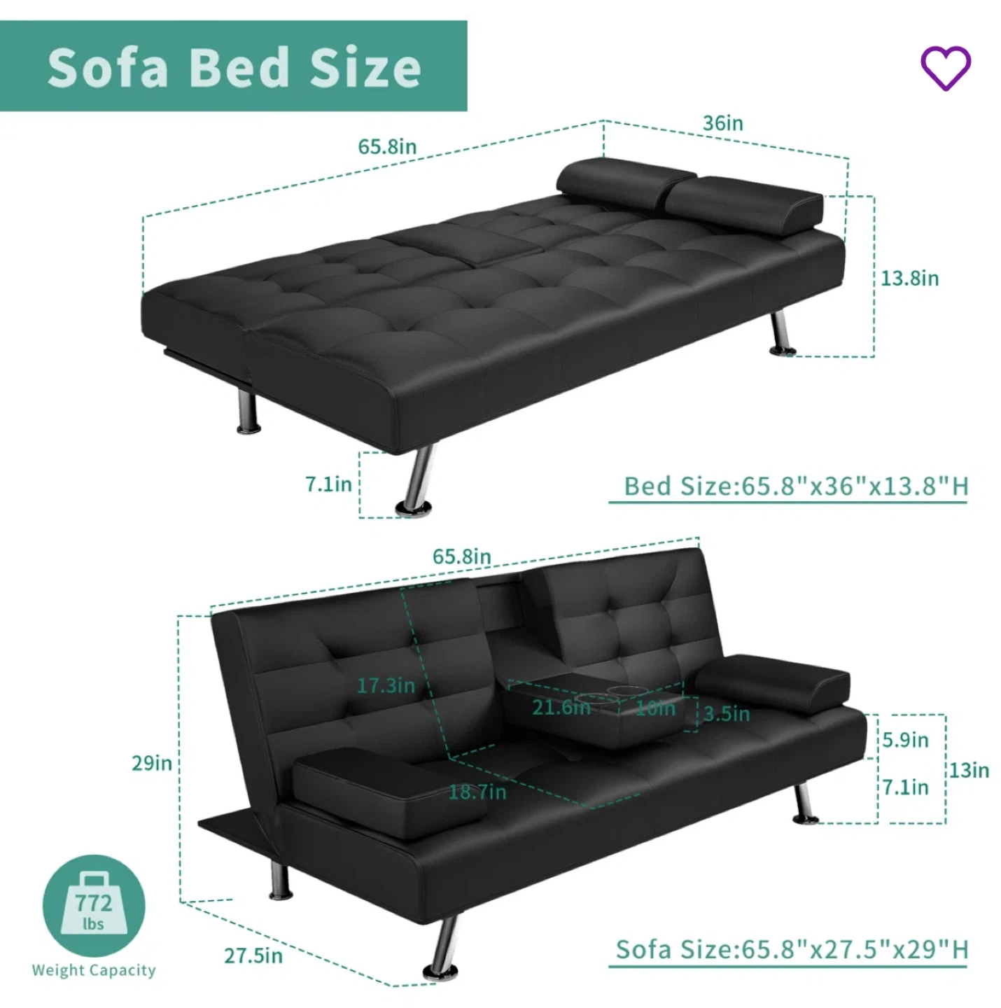Looking to sell this super comfy black faux leather sofa bed! It's in great condition and perfect for small spaces. cushion included.