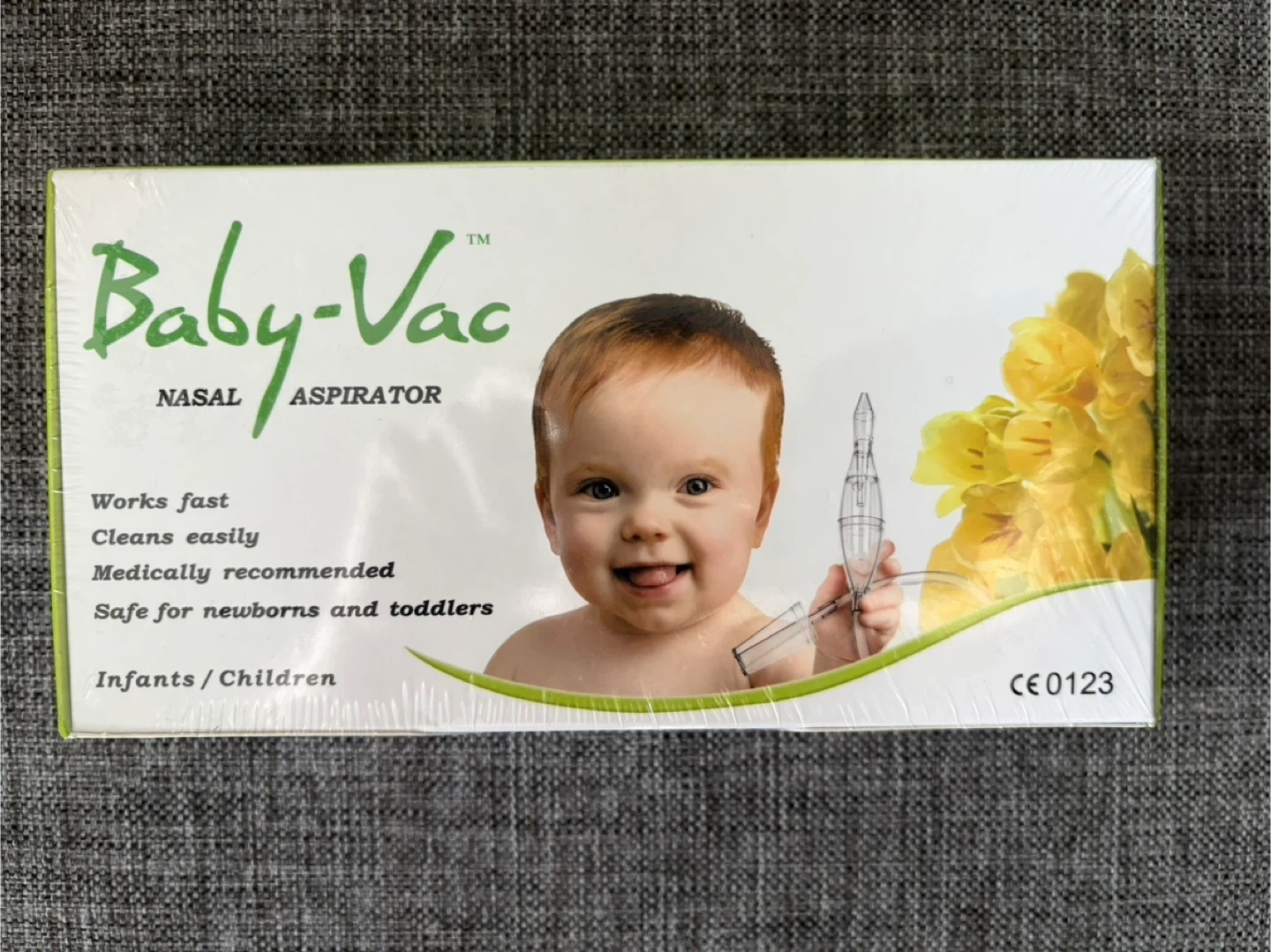 Brand new Baby-Vac Nasal Aspirator still in its original packaging! It's designed for infants and children to help clear a runny or stuffy nose. It's medically recommended and works fast and cleans easily. Keep your little one comfortable!