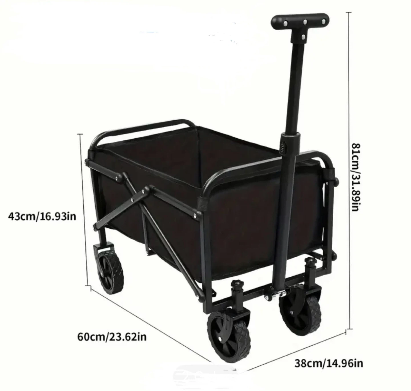 Brand new never opener! Selling a folding wagon cart in black! It's quite spacious with dimensions of approximately 43cm/16.93in in height, 60cm/23.62in in length, and 38cm/14.96in in width. The handle extends to about 81cm/31.89in. Perfect for carrying groceries, camping gear, or anything else you need to haul around