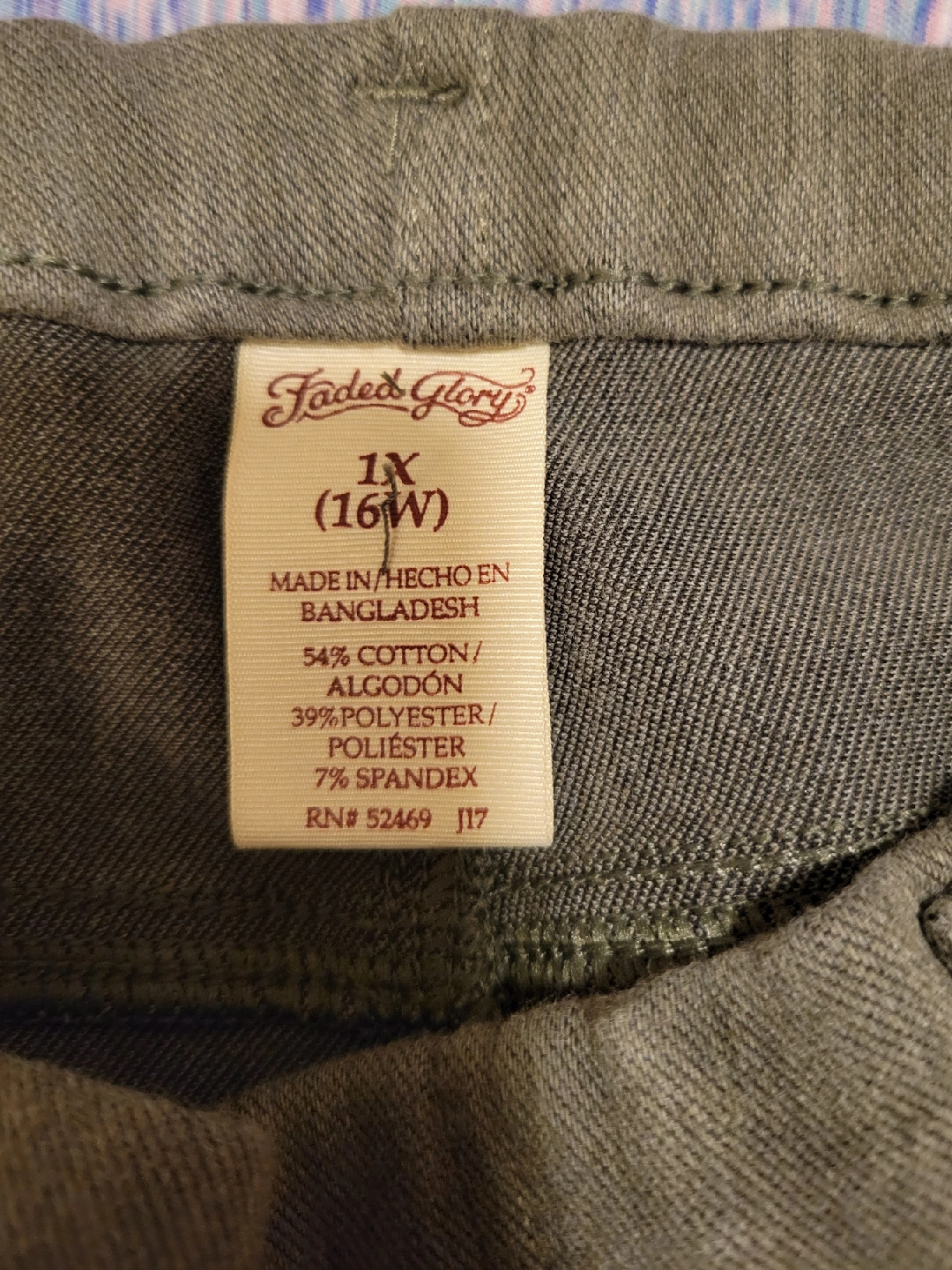 92Selling a pair of Faded Glory pants in olive green. They are size 1X (16W). The material is 54% cotton, 39% polyester, and 7% spandex