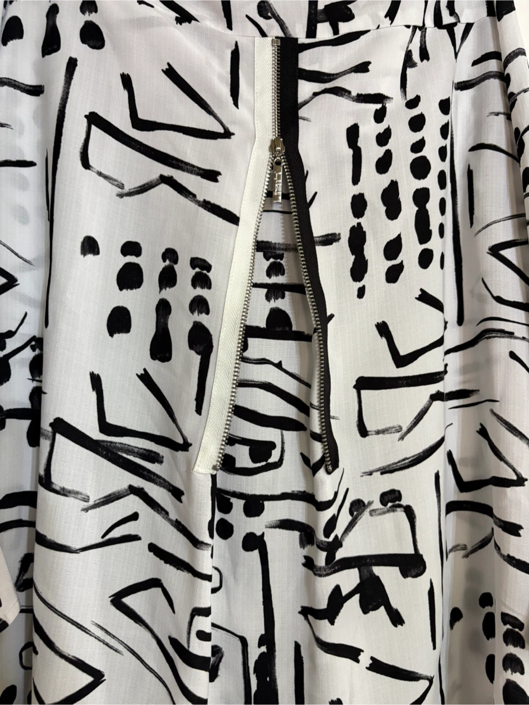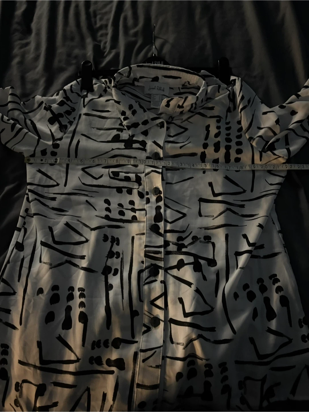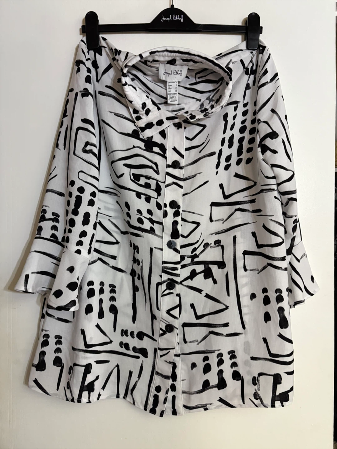 Selling a Joseph Ribkoff blouse in a striking black and white pattern. It's a size 12. The blouse features a unique design with buttons and a zipper in the back for extra adjustment.