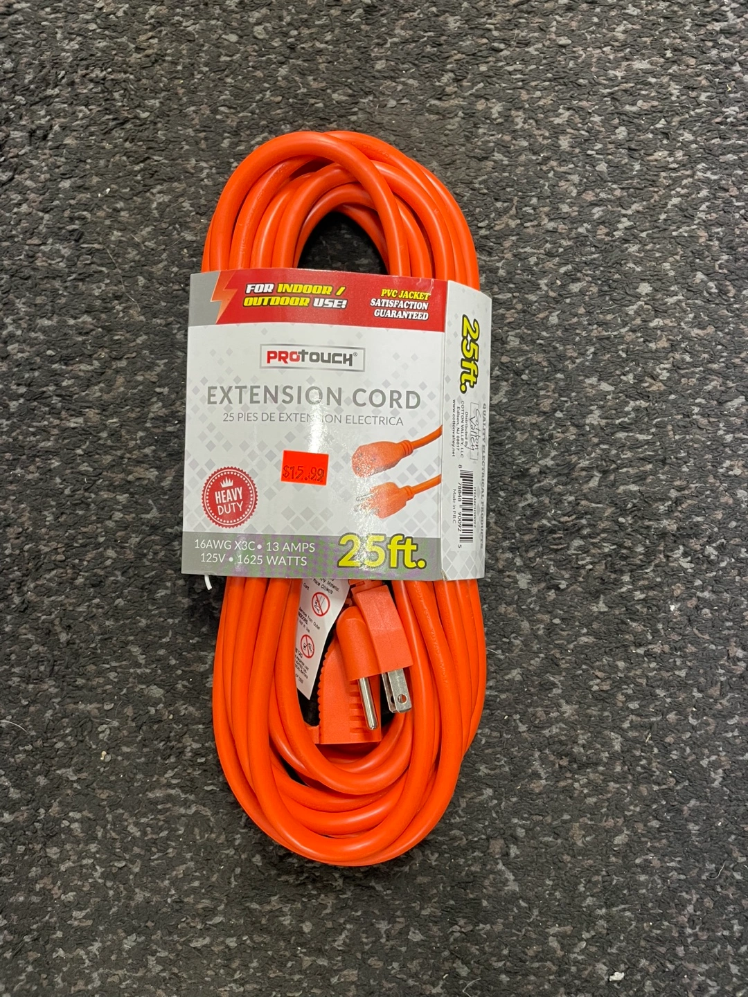 Brand new! Selling a PROTOUCH extension cord, perfect for indoor or outdoor use! It's 25 feet long and features a durable PVC jacket with satisfaction guaranteed. This heavy-duty cord is 16AWG X3C, 13 Amps, and 125V - 1625 Watts. It was originally $15.00