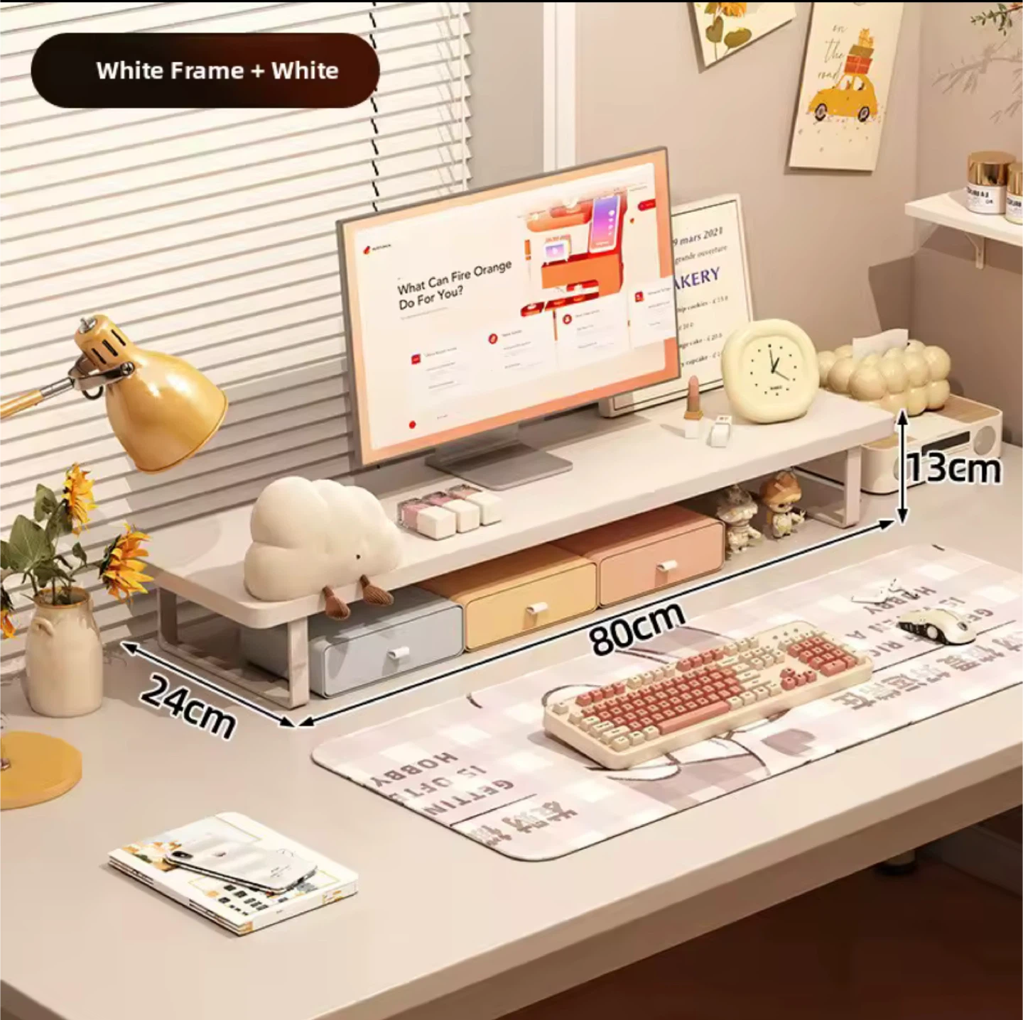 Selling a white monitor stand riser! It's great for organizing your desk and raising your monitor to a comfortable viewing height. Features some handy storage drawers as well. The dimensions are approximately 80cm wide, 24cm deep, and 13cm high. It's in great condition and comes with the box. However there’s a chip.