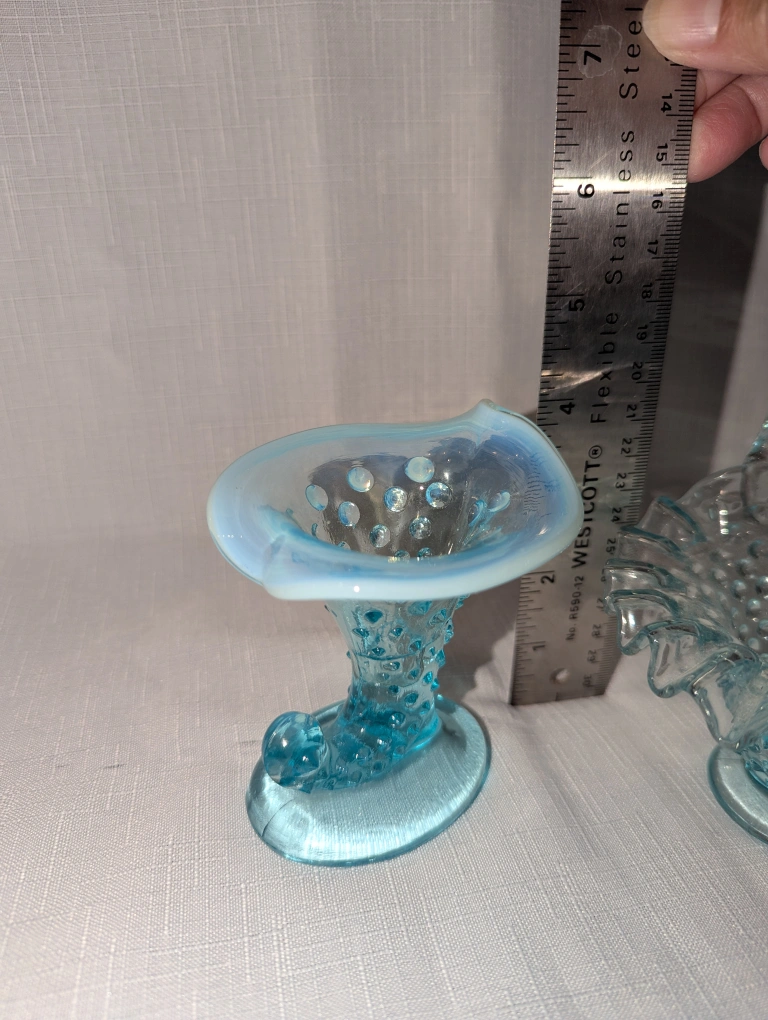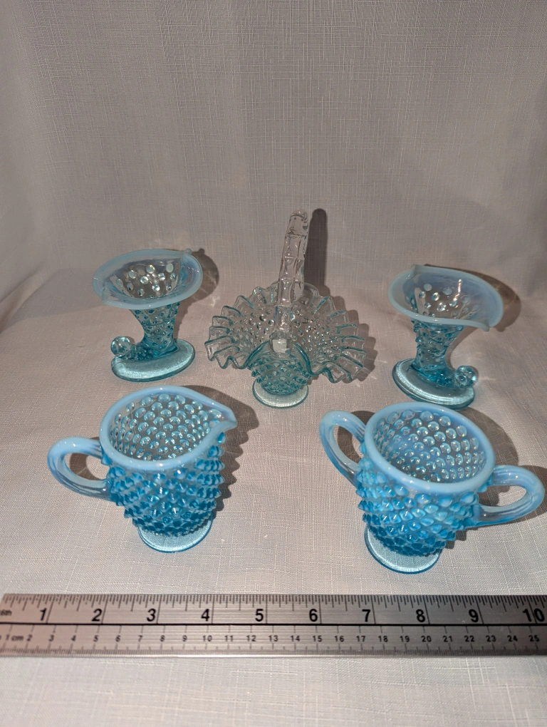 Selling beautiful pieces of vintage Fenton blue opalescent hobnail glass!