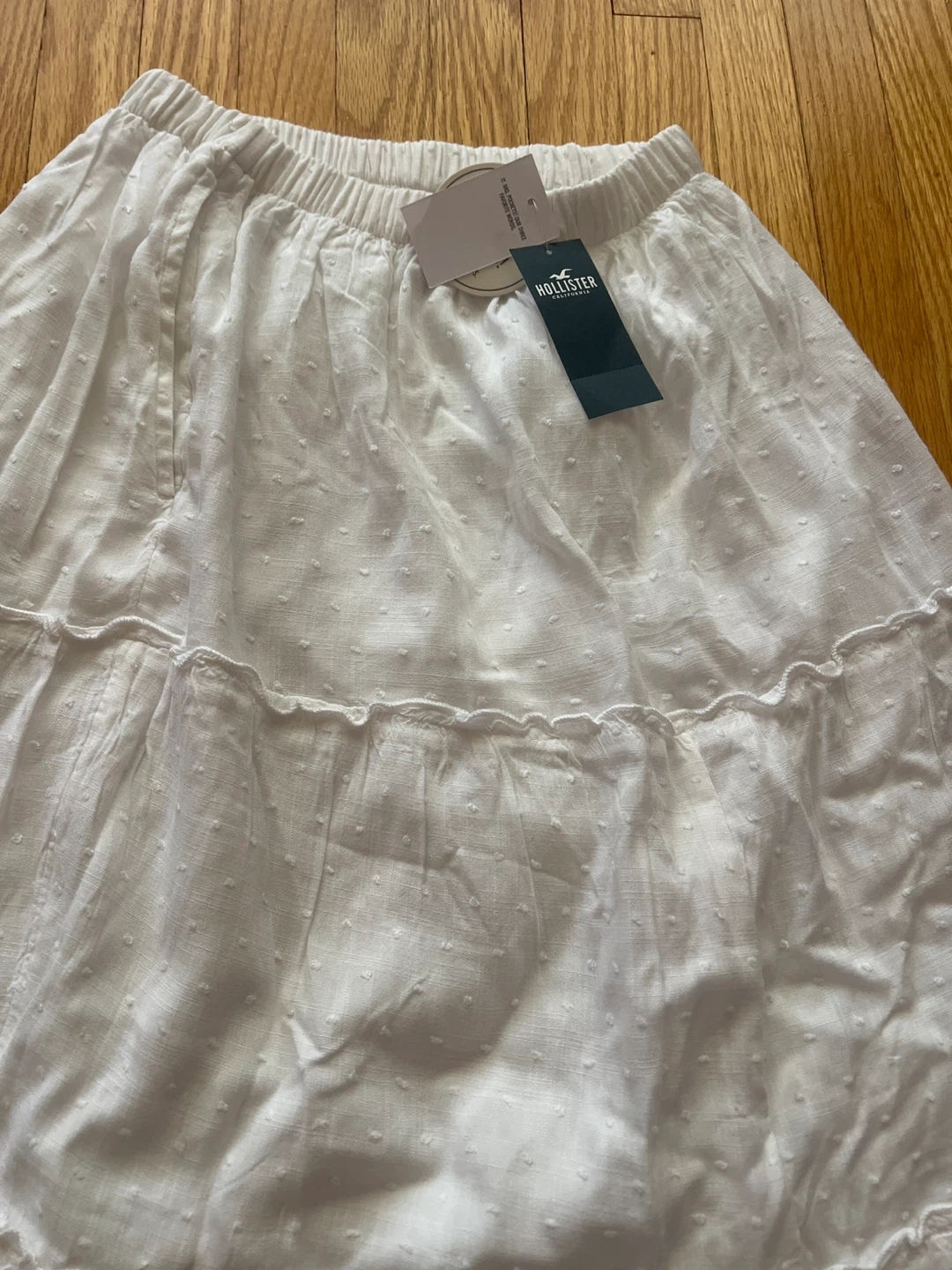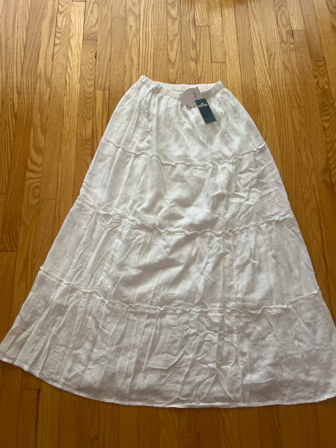 This is a brand new Hollister white tiered maxi skirt with the tags still on! It's a lovely, flowy skirt that's perfect for summer and fall days. The material is light and airy, making it super comfortable to wear. 33 inches in length. It features an elastic waistband for a flexible fit and a tiered design that adds a touch of elegance. It also has pockets! size extra small. Item comes from a pet and smoke free home. Port union/401/Pickering for pick up.