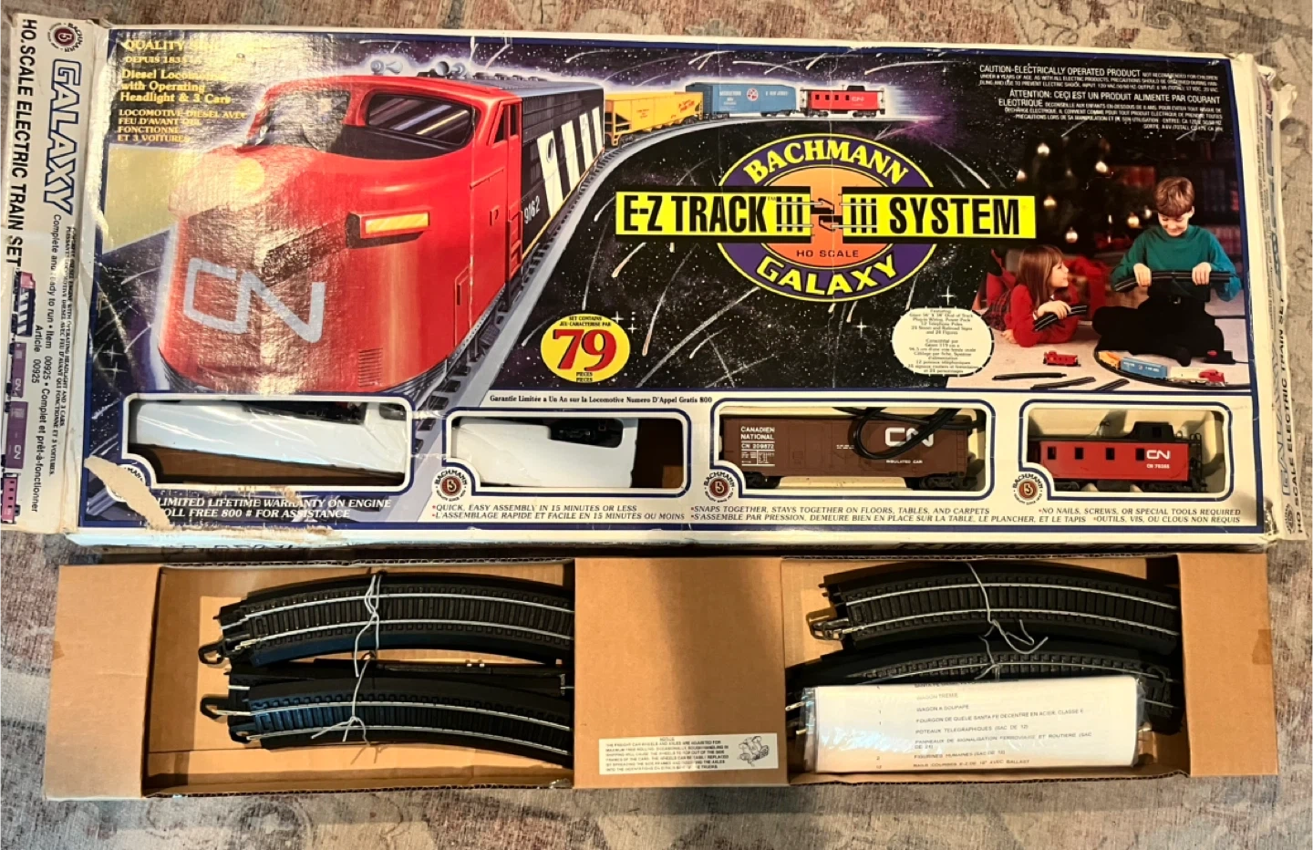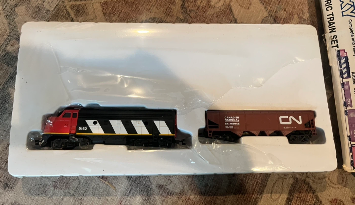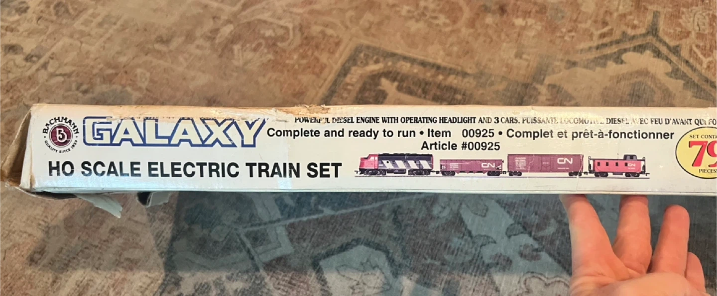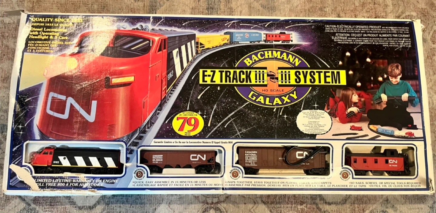 Bachmann Galaxy EZ Track train set. This a very nice collector train. My late uncle gave it to me when I was a kid (over 30 yrs ago) and I’ve never played with it. He was a train collector and had lots running in their train room at all times, very neat. I didn’t know I still had it. It looks new in box, tape in tact and twist ties in place around tracks. I never opened it. 56”x 38” oval track. 24 signs, 24 figures. Operating headlights. 79 pieces. quick and easy assembly. Perfect for train enthusiasts!