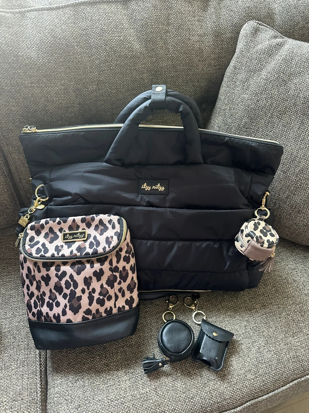 This is a gently used black diaper bag tote set from Itzy Ritzy! It includes a matching leopard print mini backpack, and two small pouches. The tote is in great condition and perfect for carrying all your baby essentials in style .. the black pacifier holder and hand sanitary holder are free with purchase they are well loved please see photos! Pickup location East 106th and 1st ave! Firm