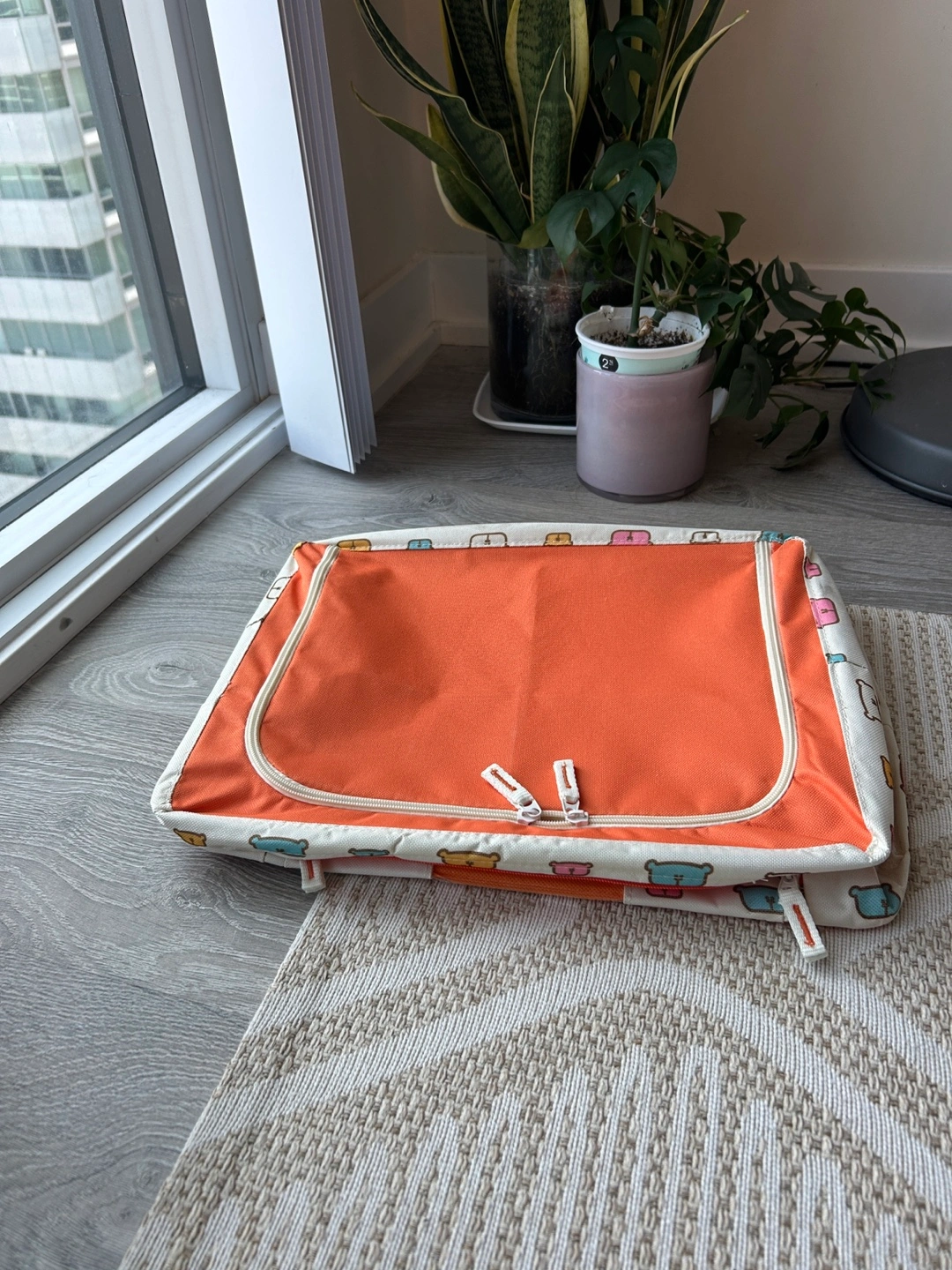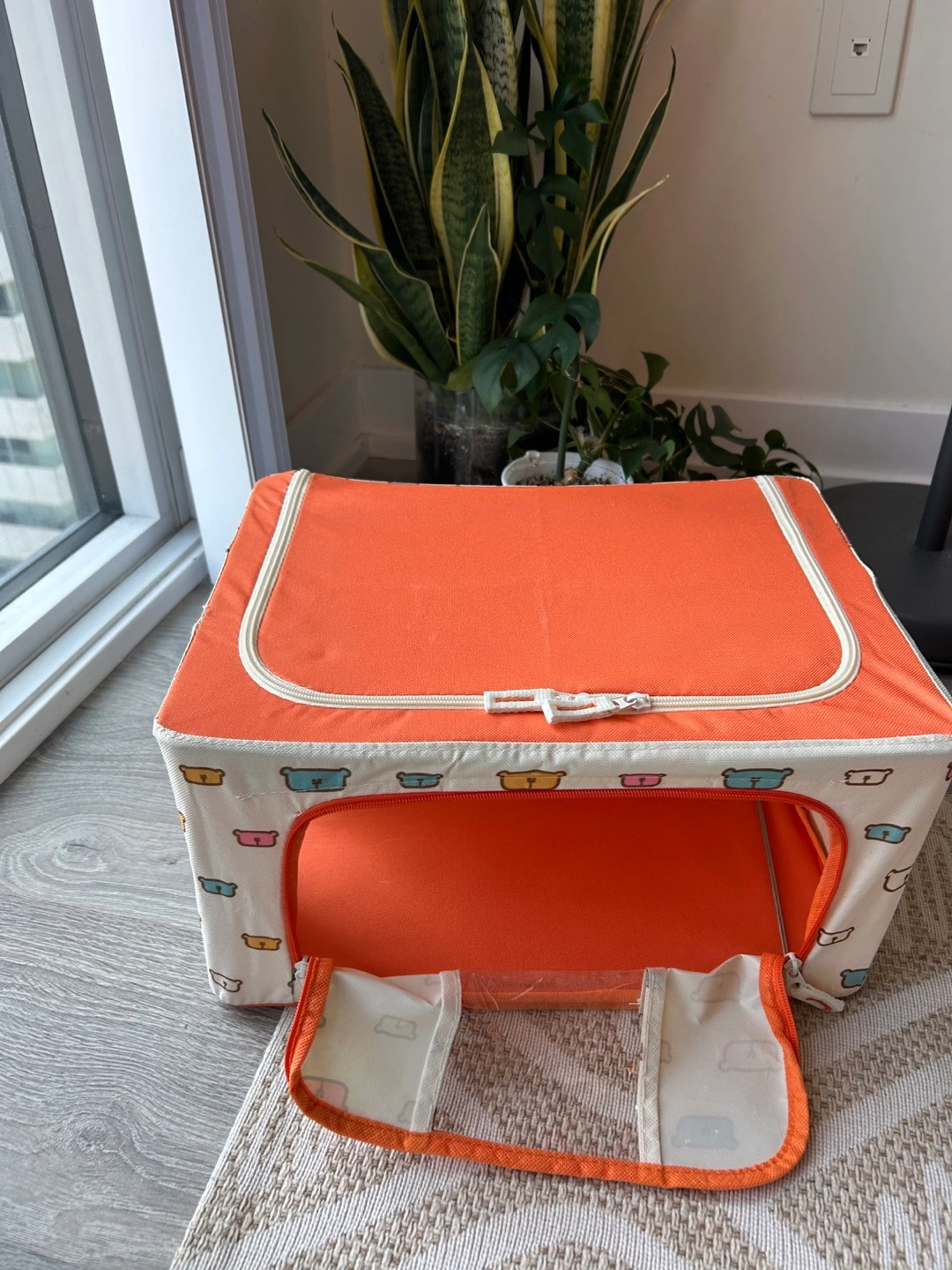 Selling an brand new foldable fabric storage box with a cute bear design! It's never been used. The box has a zippered closure and a clear window to see what's inside. It's a great size for storing clothes, toys, or other household items. It's lightweight and easy to use