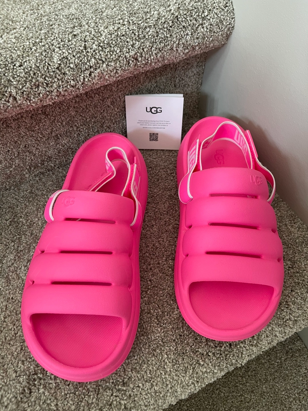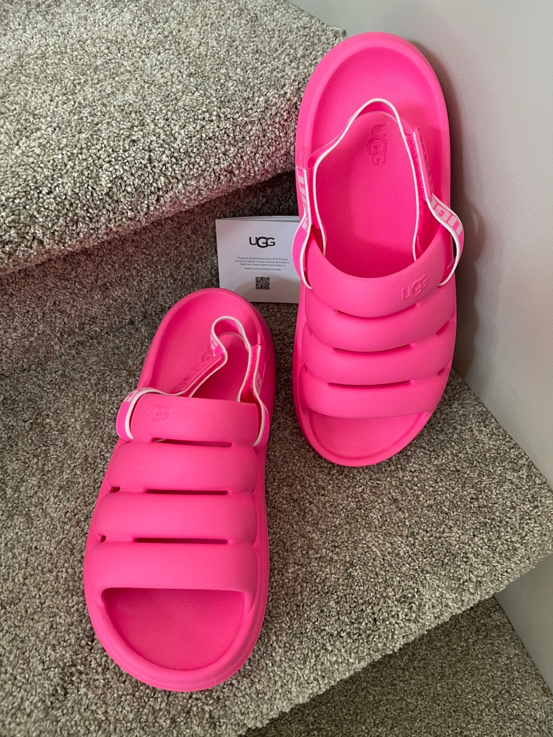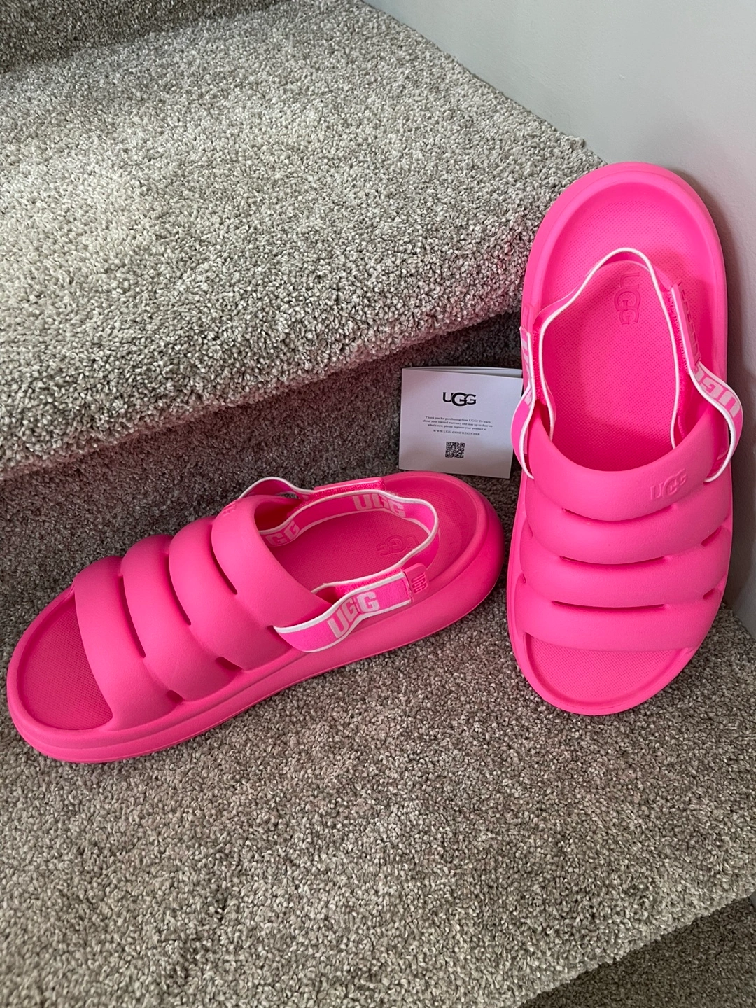 ***JUST REDUCED***These BRAND NEW UGG Sport “FLUFF YEAH SLIDES” are super cute and comfy! Size - Ladies 10. They are a vibrant pink colour which is PERFECT for adding a pop of colour to your outfit!
