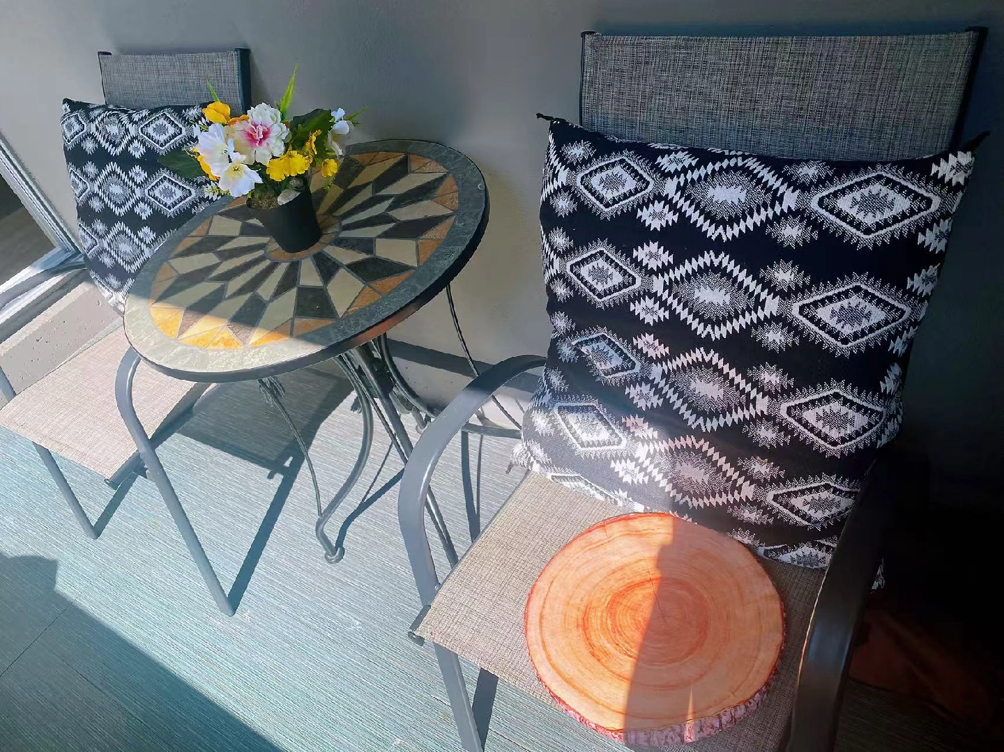 Cute patio set with two chairs and a small table! It's perfect for a small balcony or backyard space. The cushions have a black and white pattern, and the table has a mosaic top. Ready for a new home!