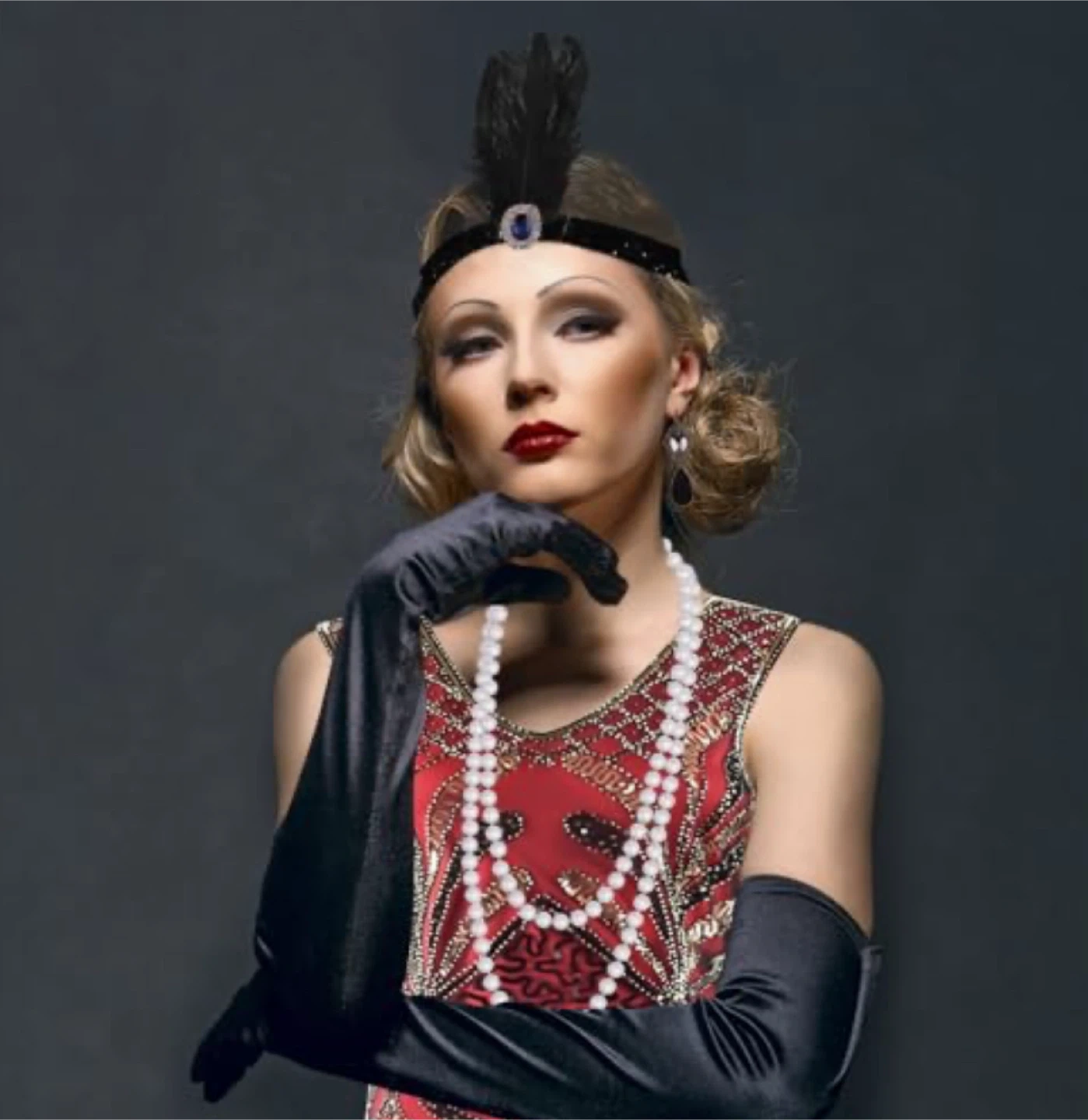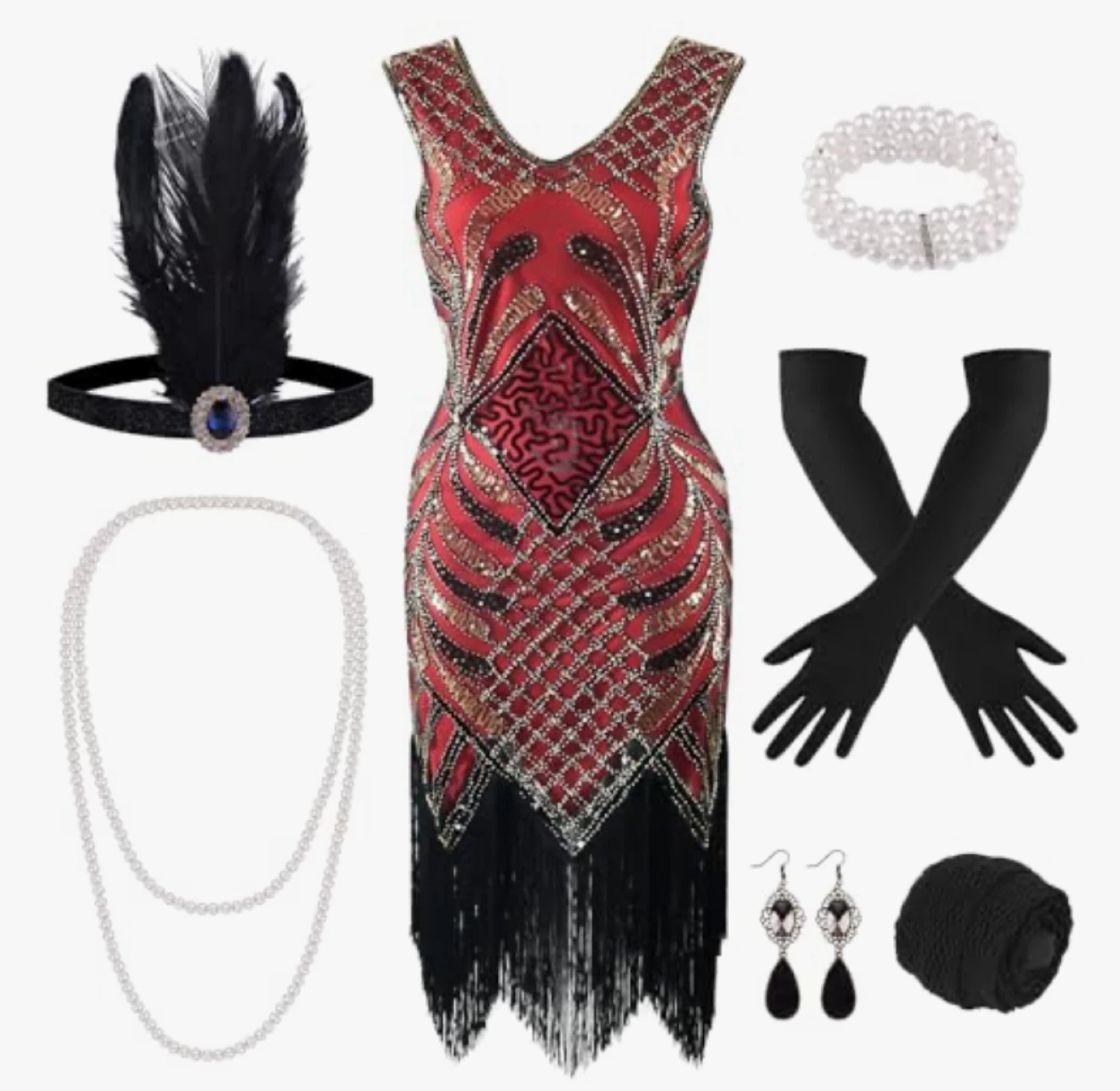 It includes everything you need for a vintage-inspired look: a beautiful flapper dress, a pearl necklace, a bracelet, gloves, gold earrings, and a feathered headband.