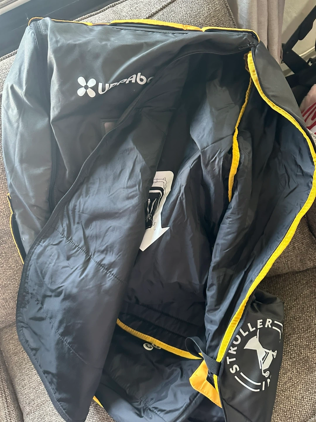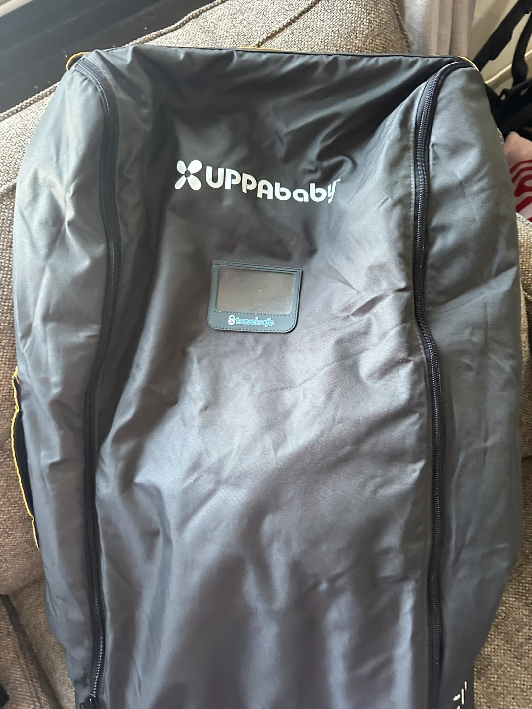 Selling an UPPAbaby stroller travel bag in black. This bag is designed to protect your stroller while traveling. It includes a separate bag for the wheels. It has some signs of use.