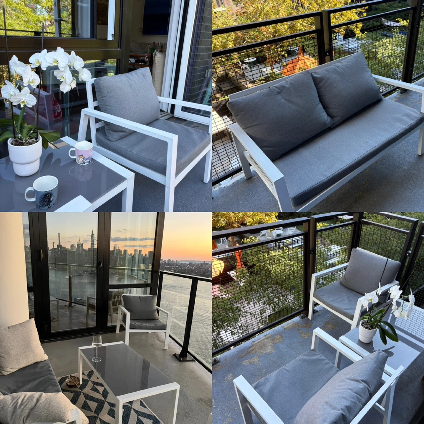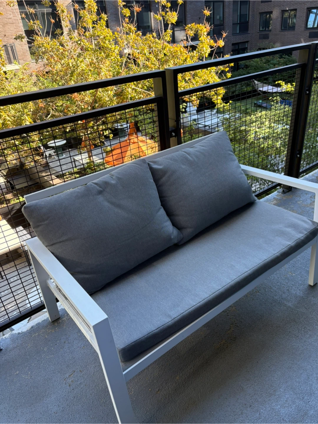 Selling a Soleil Jardin 4-Piece Aluminum Outdoor Patio Furniture Set. It's a stylish and comfortable set that includes a sofa, two chairs, and a coffee table, perfect for enjoying your outdoor space. Originally bought for $444.99